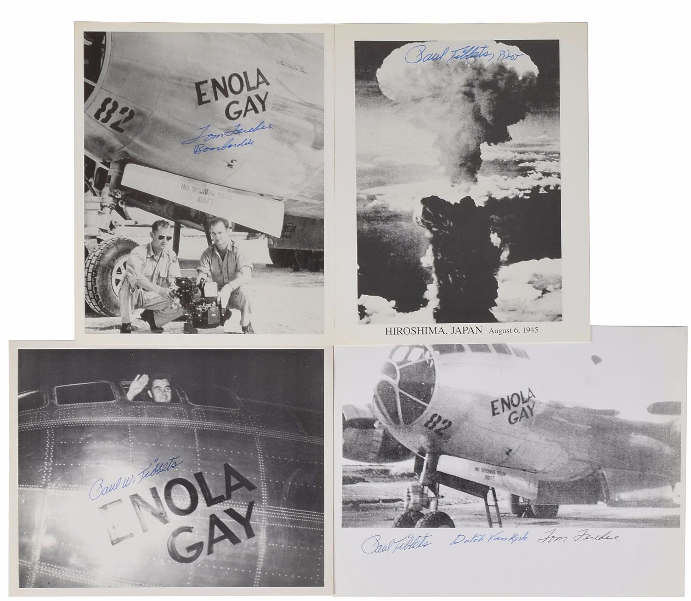 Four cardstock photos, ranging in size from 8 x 10 to 11 x 8.5, each signed in ink or ballpoint by one or more Enola Gay crew members, including: Paul Tibbets (2); Tom Ferebee; and Tibbets, Ferebee, and Dutch Van Kirk. In overall fine condition.