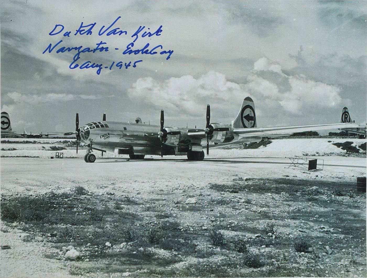 Two semi-glossy photos: a color 10 x 8 close-up photo of the Enola Gay, with a man working below the cockpit area, signed in black felt tip, "Tom Ferebee, Bombardier"; and a full-length 10 x 8 photo of the Enola Gay bomber, signed in blue felt tip, "Dutch Van Kirk, Navigator—Enola Gay, 6 Aug–1945." In overall fine condition.