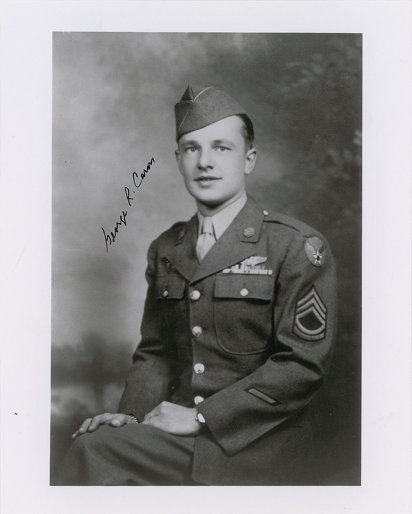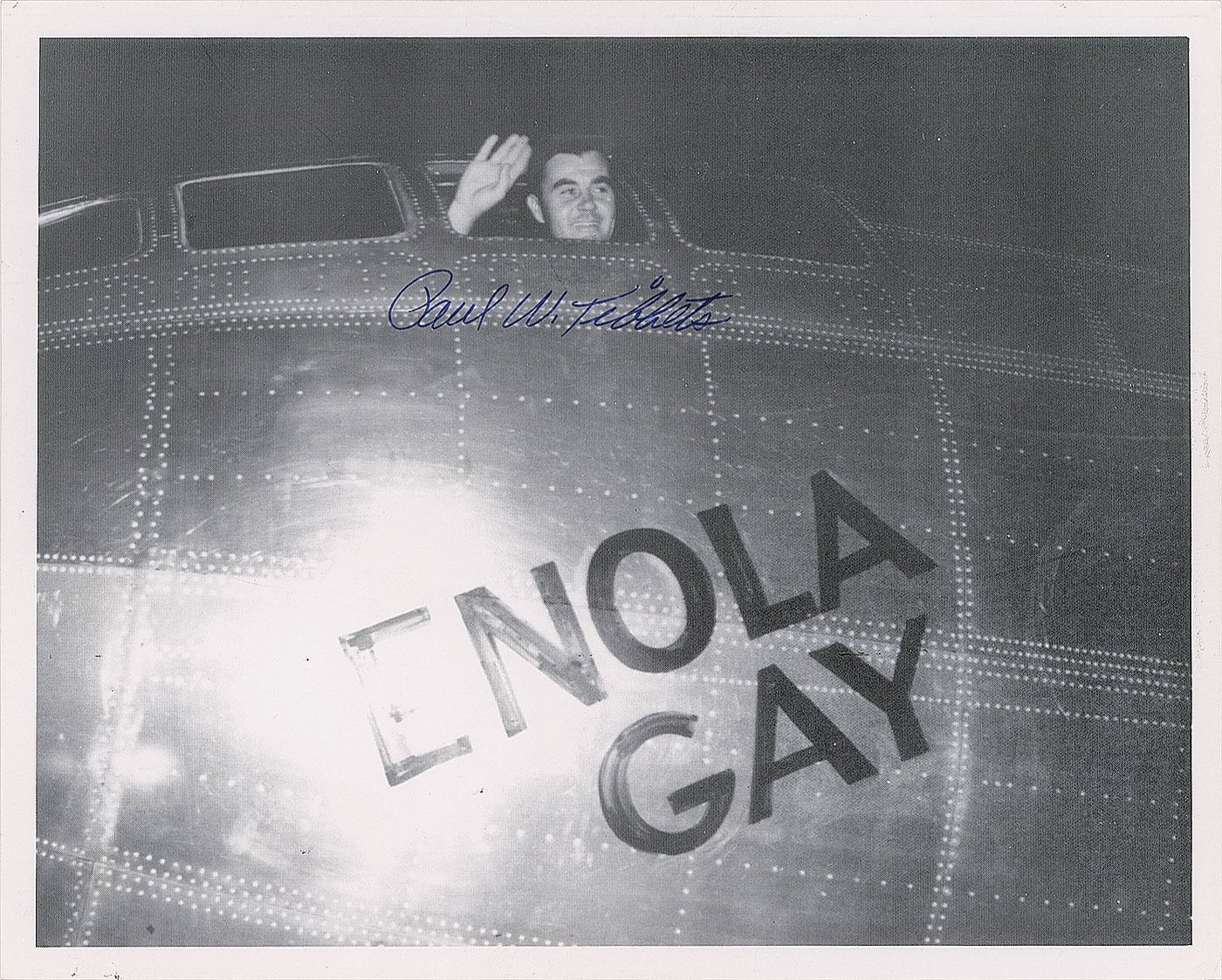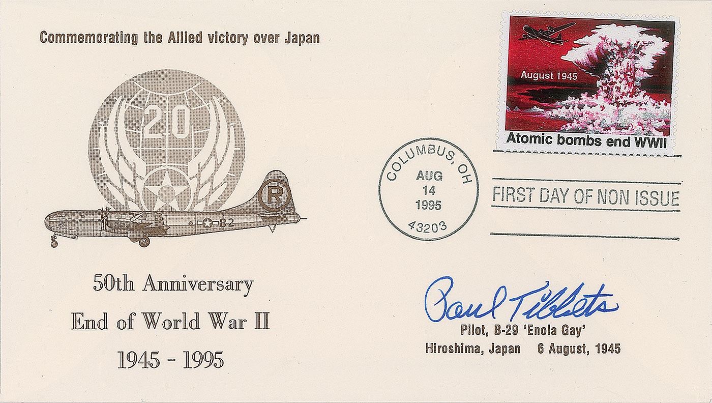 Three items: a glossy 8 x 10 photo of George R. Caron, the tail gunner, the only defender of the twelve crewmen, aboard the B-29 Enola Gay, signed in black felt tip; a glossy 10 x 8 cardstock photo of pilot Paul W. Tibbets waving from inside the Enola Gay cockpit, signed in blue ink; and an FDC bearing a cachet honoring the 50th anniversary of the end of World War II, signed in blue ink by Tibbets; cover is stamped “First Day of Non Issue” because the 'atomic explosion' postal stamp was rescinded by the US Postal Service after protests from the Japanese government. In overall fine condition.