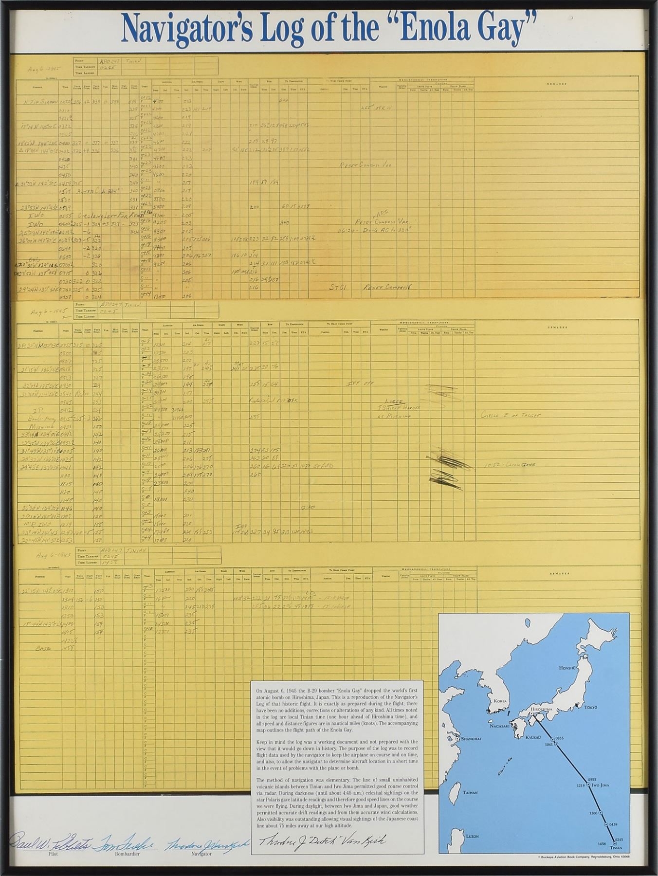 Color 18 x 24 poster reproducing the navigator's log of the Enola Gay from its historic flight on August 6, 1945, signed in the lower left in blue felt tip by Paul W. Tibbets, Tom Ferebee, and Dutch Van Kirk. Framed and in fine condition.