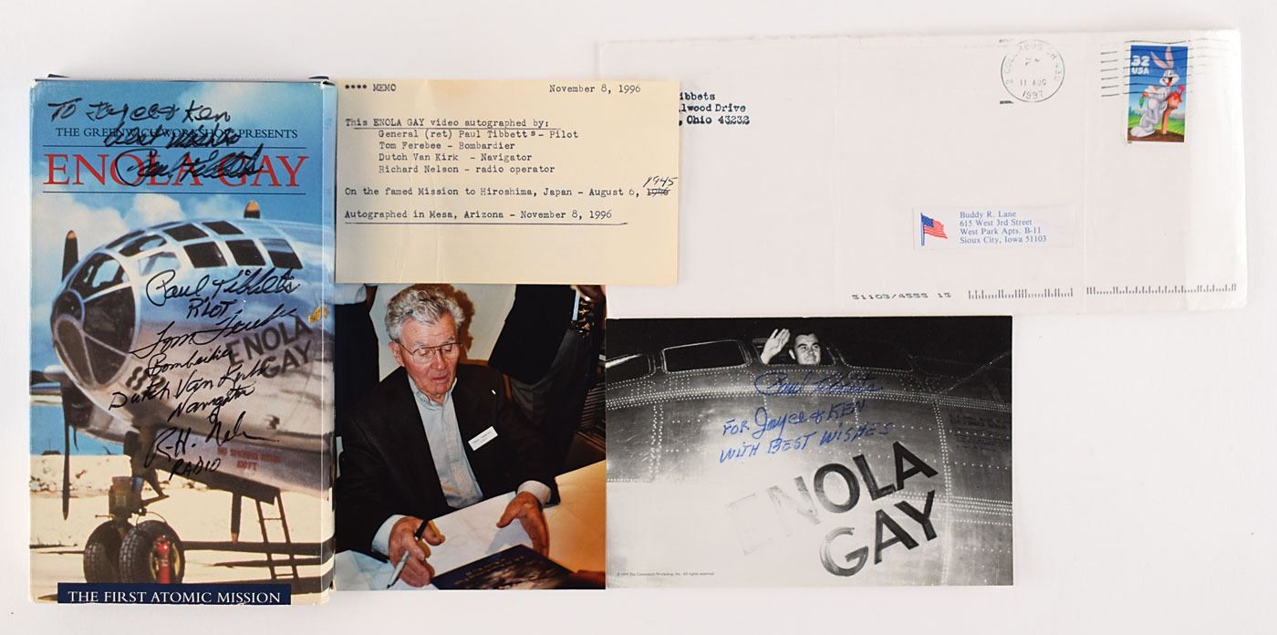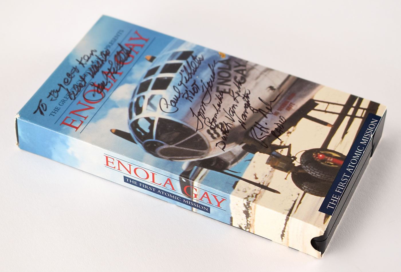 VHS tape of the documentary 'Enola Gay: The First Atomic Mission' presented by Greenwich Workshop, signed on the cardboard sleeve in black felt tip, "Paul Tibbets, Pilot," "Tom Ferebee, Bombardier," "Dutch Van Kirk, Navigator," and "R. H. Nelson, Radio," and also signed and inscribed at the top, "To Joyce & Ken, Best Wishes, Paul Tibbets." In fine condition. Accompanied by a postcard photo of Tibbets in the Enola Gay cockpit, signed and inscribed in blue ballpoint, "Paul Tibbets, For Joyce & Ken, With Best Wishes."