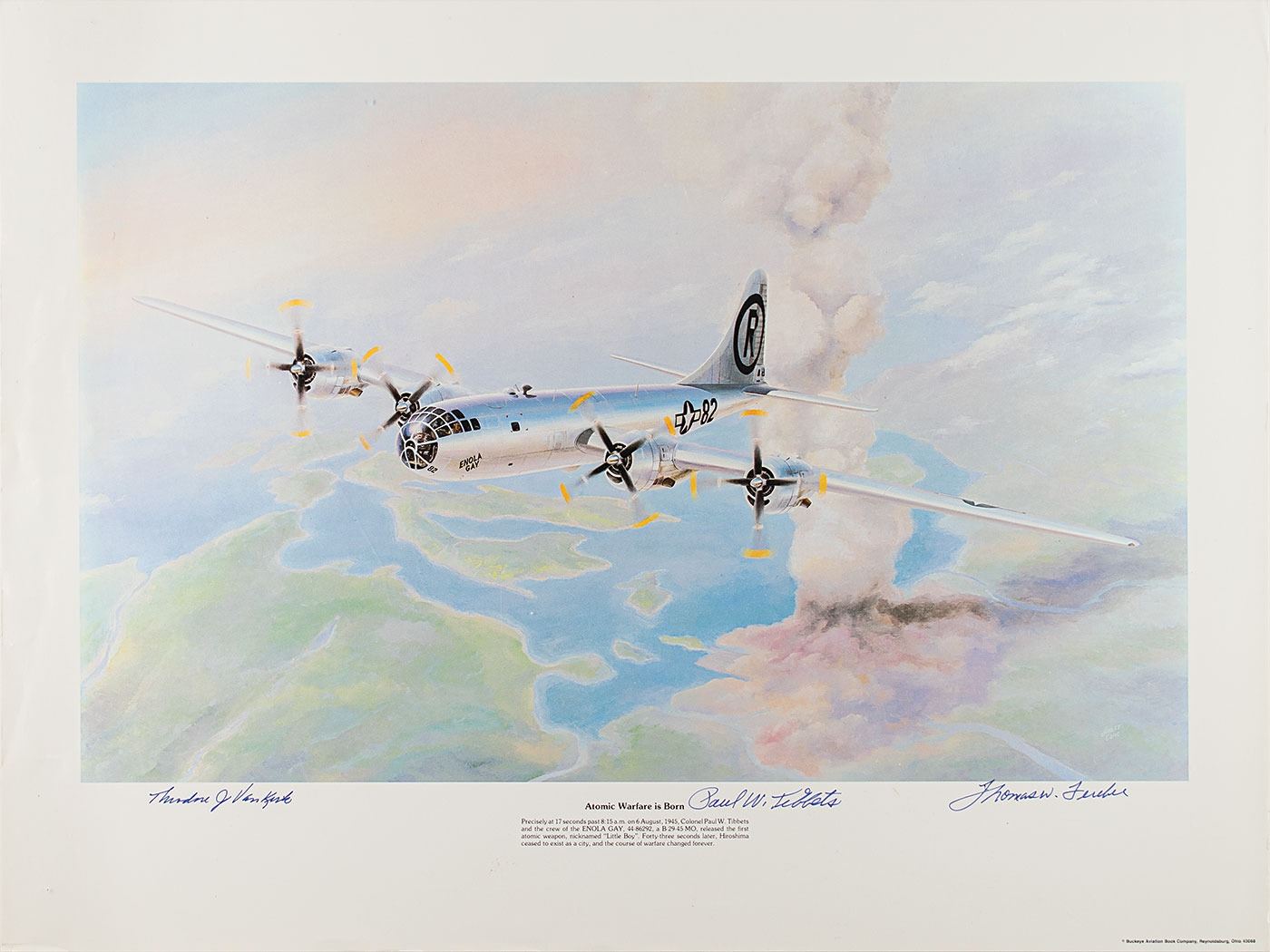 Color 24 x 18 print entitled ‘Atomic Warfare Is Born,’ signed in blue felt tip, “Theodore J. Van Kirk,” “Paul W. Tibbets,” and “Thomas W. Ferebee.” In very good to fine condition, with some creasing to the borders, heaviest to the lower left.