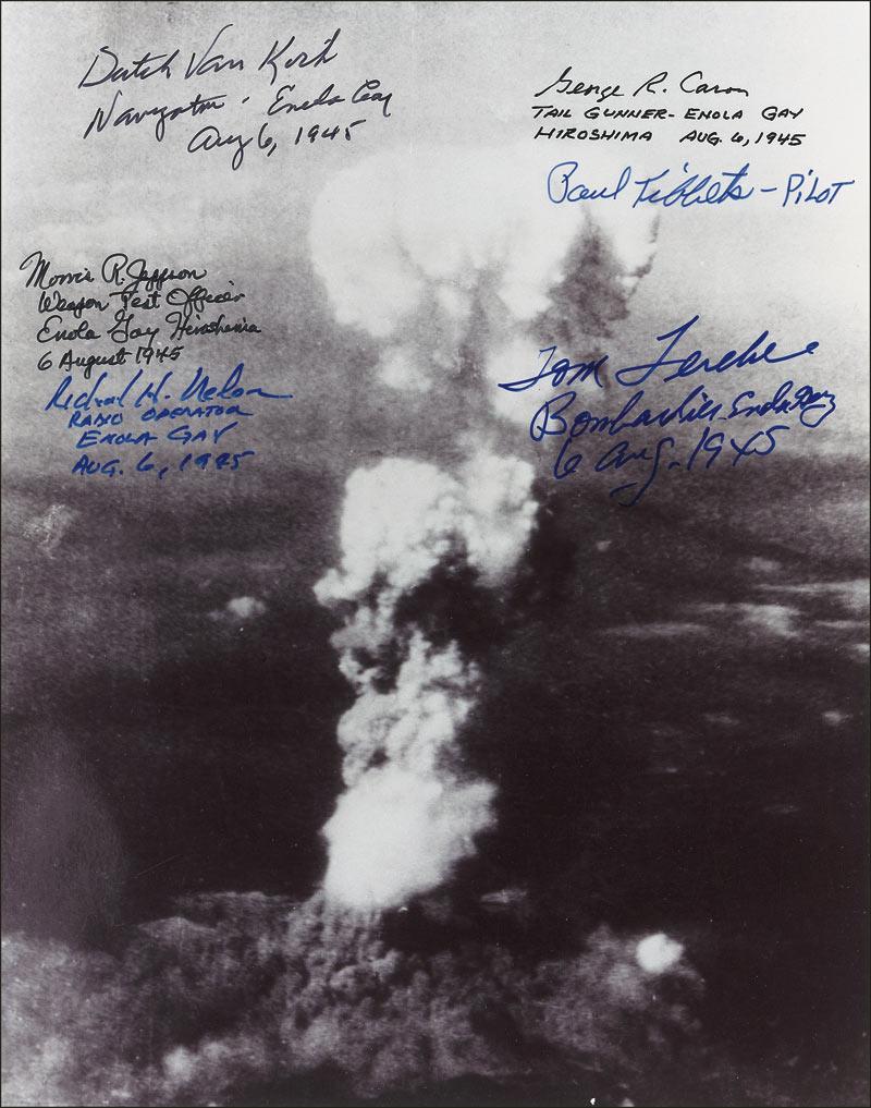 Glossy 8 x 10 photo of the Hiroshima mushroom cloud, signed in blue and black felt tip by Paul Tibbets, Dutch Van Kirk, Morris Jepson, Richard Nelson, George Caron, and Tom Ferebee, all adding their flight assignments, and all but Tibbets adding the date of the mission. In very fine condition. RRAuction COA.