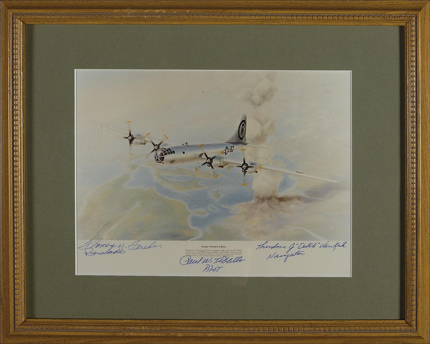 Color satin-finish 10 x 8 photo of a print of the Enola Gay entitled Atomic Warfare is Born, signed in blue felt tip by Paul Tibbets, Thomas Ferebee, and Theodore “Dutch” Van Kirk, with each adding their flight assignments under their signatures. Matted and framed to an overall size of 15.5 x 12.5. In very fine condition. RRAuction COA.