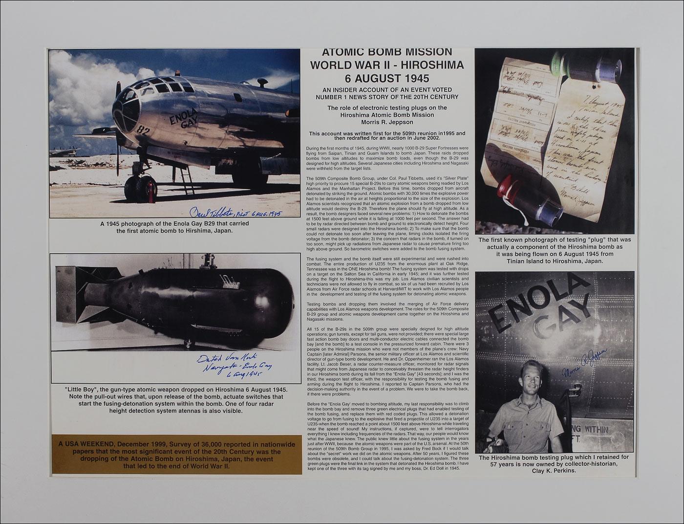 Color 22 x 16 print bearing a printed account of the delivery of the atomic bomb over Hiroshima during World War II and encompassing four photos, signed in blue felt tip by Paul W. Tibbets, Dutch Van Kirk, and Morris R. Jeppson, with Tibbets and Van Kirk adding their flight assignments and the mission date. Matted to an overall size of 26 x 20. In fine condition. Oversized. RRAuction COA.