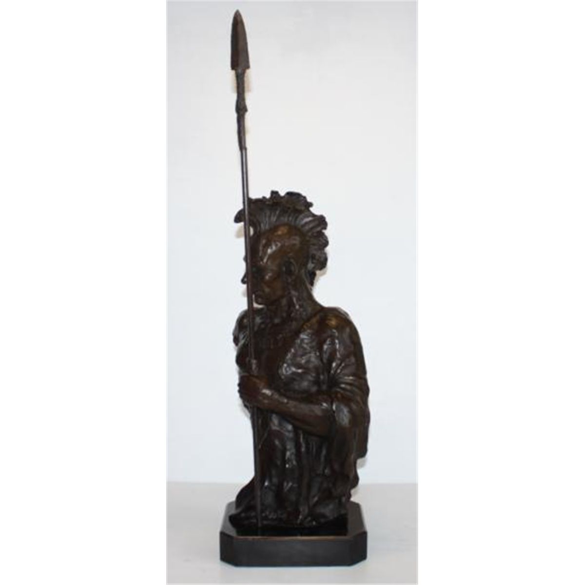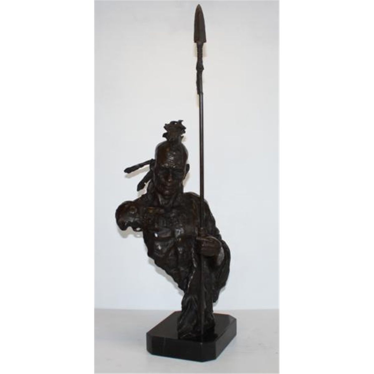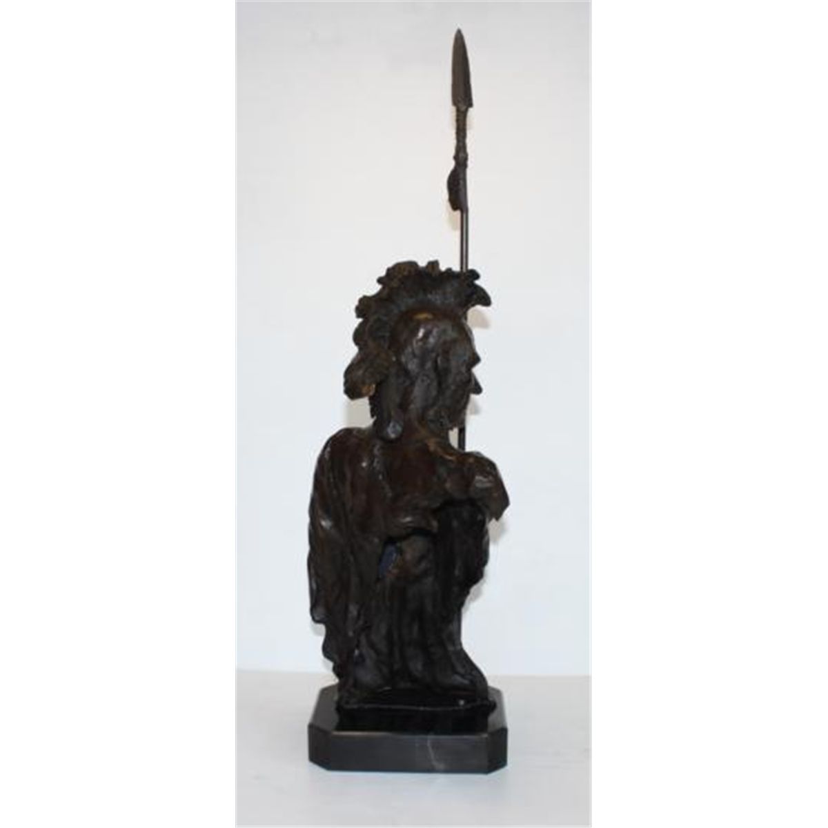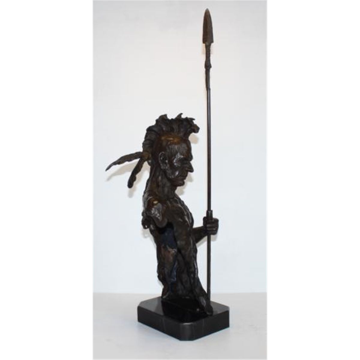 Indian Chief with Spear Bronze Sculpture Bust, After Bzach, 29"H x 12"W x 10"D 30 lbs. This bronze sculpture was produced using the "Lost Wax" casting method. The"Lost Wax" Cast method is the most precise metal casting technique in existence, ensuring exquisite detail of the original host model which is usually sculpted in clay or wax. This "Lost Wax" casting method is an extremely labor intensive and expensive process, but the end results produce a Heirloom Quality Masterpiece!