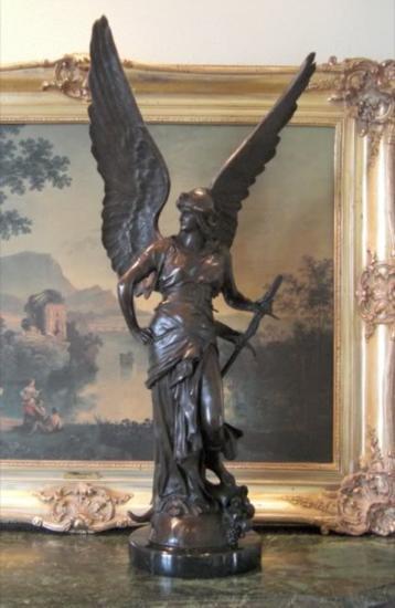 Aurora Winged Victory Goddess Bronze Sculpture, After Beach, 33"H x 14"W x 11"D 55 lbs. This bronze sculpture was produced using the "Lost Wax" casting method. The"Lost Wax" Cast method is the most precise metal casting technique in existence, ensuring exquisite detail of the original host model which is usually sculpted in clay or wax. This "Lost Wax" casting method is an extremely labor intensive and expensive process, but the end results produce a Heirloom Quality Masterpiece!Aurora is the Latin word for dawn, the goddess of dawn in Roman mythology and Latin poetry. Aurora is comparable to the Greekgoddess Eos, though Aurora did not bring with her any resonance of a greater archaic goddess.In ancient Roman mythology Aurora, goddess of the dawn, renews herself every morning and flies across the sky, announcing the arrival of the sun. Her parentage was flexible: for Ovid she could equally be Pallantis, signifying the daughter of Pallas, or the daughter of Hyperion. She has two siblings, a brother (Sol, the sun) and a sister (Luna, the moon), and four children (the Anemoi, or Winds.)Aurora appears most often in Latin poetry with one of her mortal lovers. A myth taken from the Greek Eos by Roman poets tells that one of her lovers was the prince of Troy,Tithonus. Tithonus was a mortal, and would age and die. Wanting to be with her lover for all eternity, Aurora asked Zeus to grant immortality to Tithonus. Zeus granted her wish, however Aurora had failed to ask him for eternal youth. As a result, Tithonus ended up aging eternally. Aurora ended up turning her beloved Tithonus into a grasshopper.