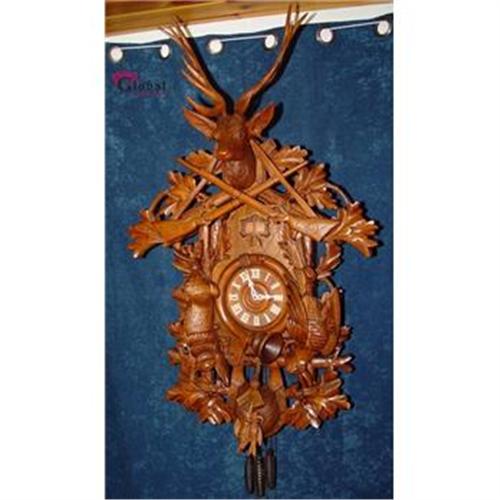 THIS HUGE CUCKOO CLOCK IS ONE OF THE MOST INCREDIBLE PIECES YOU WILL LAY EYES ON!SIMPLY INCREDIBLE!!Take a moment and get a look at one of the most fabulous and biggest cuckoo clocks we have had the pleasure to offer for auction in some time!!This Gigantic cuckoo clock of 48 Inches tall is made of the finest birch wood and has the warm gorgeous patina of walnut.The moment you hear that distinctive call as the cuckoo pops out of the little door in the carved wood, you will be transported back to a time of great clock making.Every full and half hour the clock plays a melody while a musician coming out.Every full and half hour the clock plays a an other melody because it has 2 different melodies.This huge black forest cuckoo clock that dates from the second quarter of the 20th C. (c. 1935) is the biggest cuckoo clock we have ever seen! For example: the rabbit is 17 Inches tall and the pheasant 16,5 Inches!! The deer head with the wooden antlers is so big like a real deer head! This is a beautifully crafted clock, complete and in good working order. The clock has a 30 hours movement and is driving by three cast iron weights.The clock is carved with two rifles, a rabbit with a pheasant, acorns with many leaves, a hunting horn,a hunting bag with two birds, and on the top a big deer head with antlers.We bought this clock out of a castle in the South of Germany near Munich.No matter where you hang this clock everyone will be begging to know where you got such an outstanding clock and ...