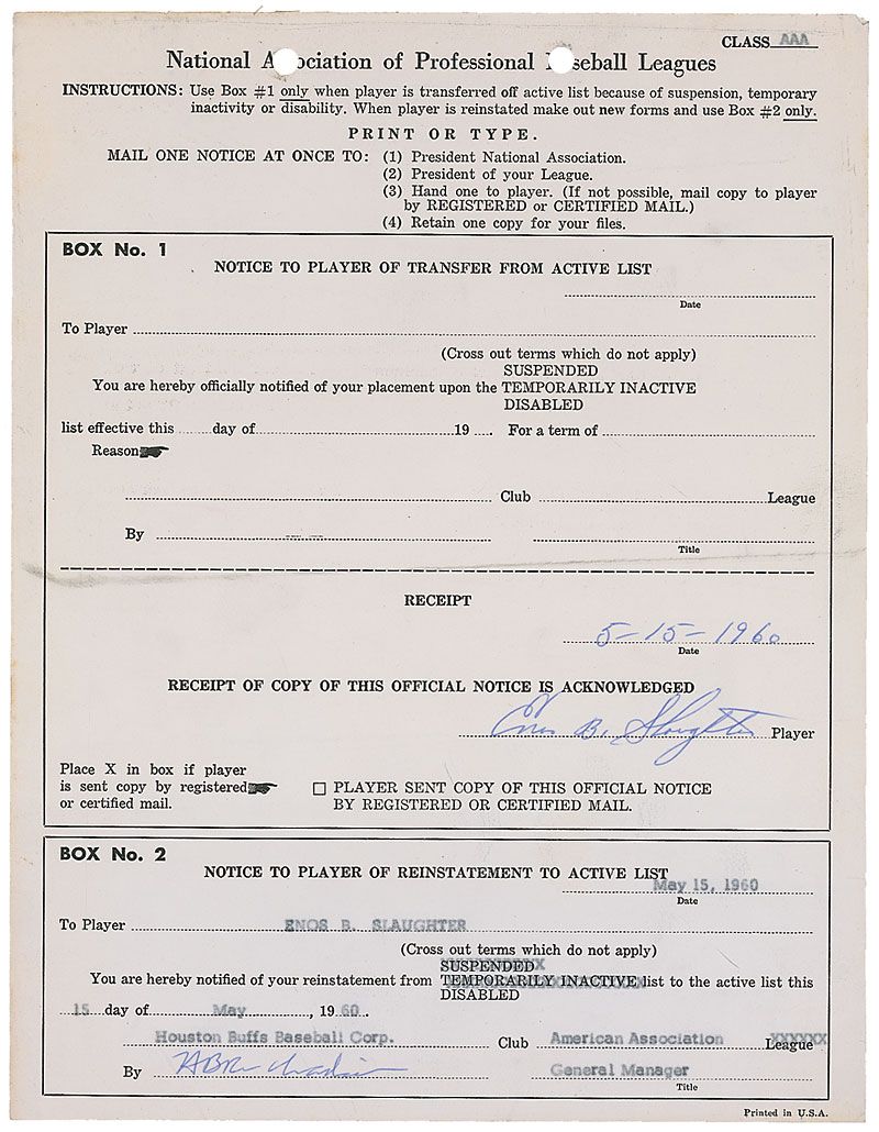 DS, signed “Enos B. Slaughter,” one page, 8.5 x 11, May 15, 1960. National Association of Professional Baseball Leagues document notifying Slaughter of his reinstatement to the active roster of the Houston Buffs minor league team after having been on the disabled list. Signed at the conclusion in blue ballpoint by Slaughter and Houston’s general manager, Spec Richardson. In fine condition, with expected document wear and a light central horizontal mark. Accompanied by an unsigned glossy photo of Slaughter during his time with the St. Louis Cardinals.