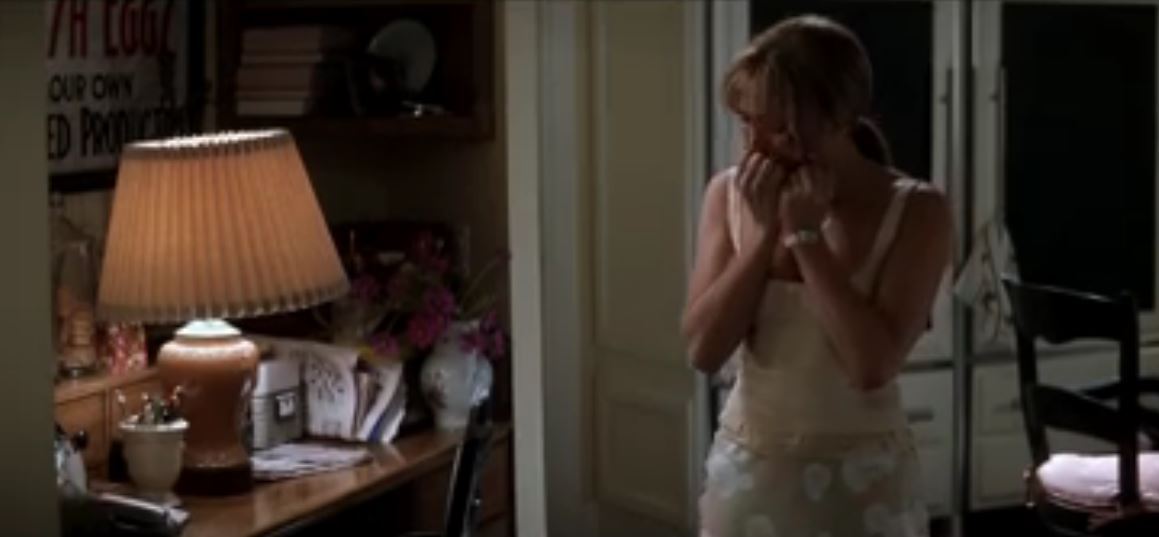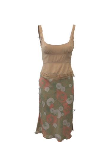 Enough (2002) - Slim Hiller (Jennifer Lopez) screen worn during a beating from Mitch (Billy Campbell), "Prada" beige crepe tank deep wide "U" zipper under left arm with 2 tier's sheer trim at bottom raw edge, with "Toaca" silk bias cut elastic waist skirt with a green, beige, peach and white dandelion print.