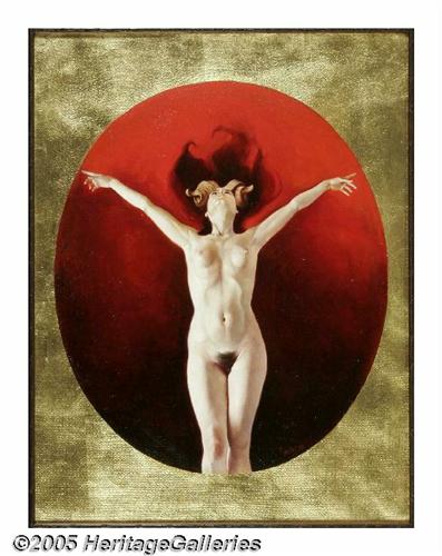 <B>Enrich Torres - Astrological Calendar Illustration Original Art (1981).</B></I> Best known for his luscious renditions of Vampirella, the Darling Daughter of Drakulon, Enrich Torres showcased his unparalleled talent for painting beautiful females (be they bloodsuckers or not) with this dazzling portrait. This sensuous scene was rendered in oil on canvas for an early eighties astrological calendar. Attractively matted, with an image area of approximately 15" x 17.5", the art is in Excellent condition. This stunning beauty will make a welcome addition to any fantasy art collection.