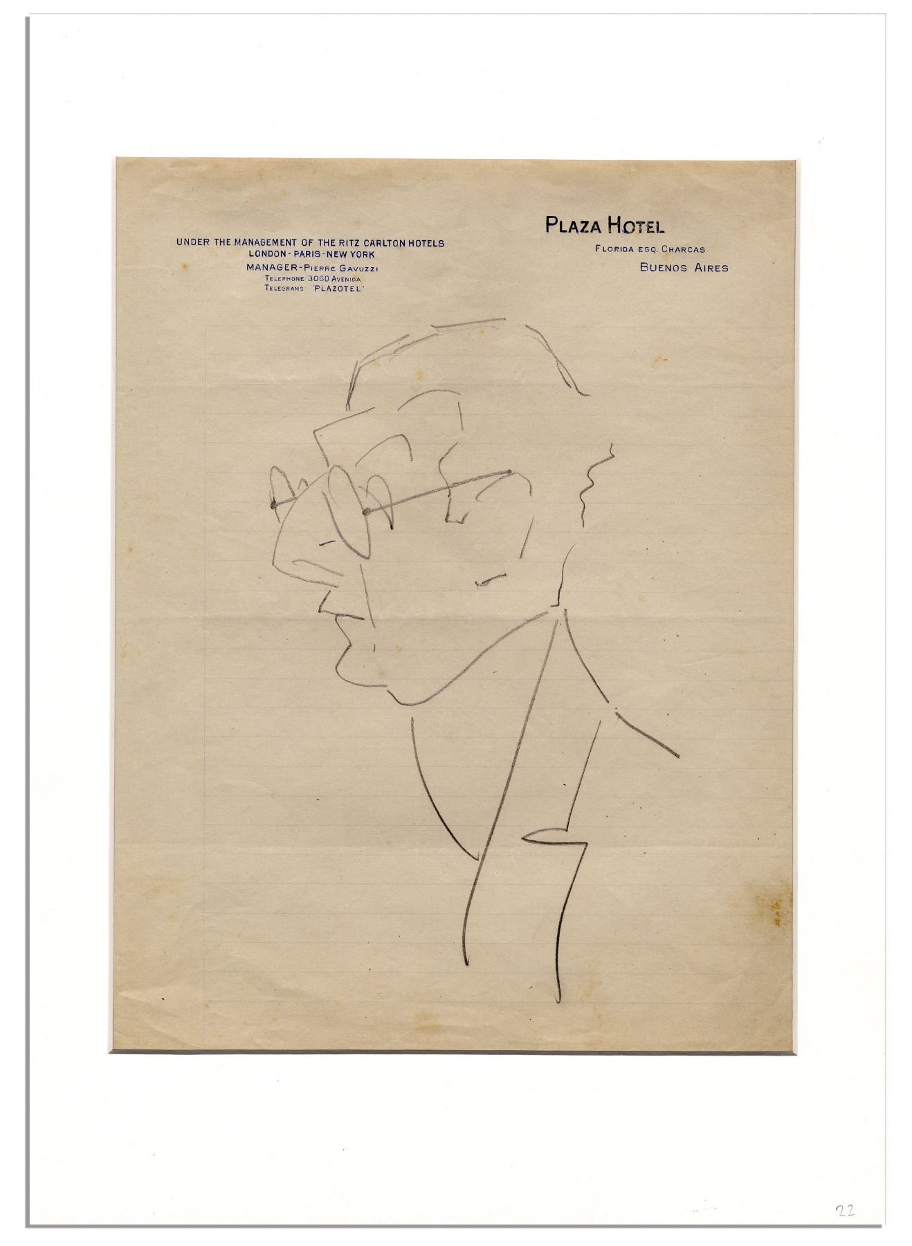 Enrico Caruso's hand-drawn sketch, unsigned, on Plaza Hotel Buenos Aires stationery. Best known for his signature role as Canio in ''Pagliacci,'' Caruso was also a pioneer in recorded sound, selling a million records at the dawn of the medium. More obscure was his passion for visual art, particularly caricatures, a medium he became quite accomplished at over his lifetime. Likely a friend or acquaintance circa 1917, as Caruso was touring South America at the time, portrait depicts a man wearing glasses and an overcoat posing stoically in profile. Drawing is done in pencil and measures 8.25'' x 10.5''. Matted in white to an overall size of 10.5'' x 14.5''. Toning throughout and minor folds, else very good condition.