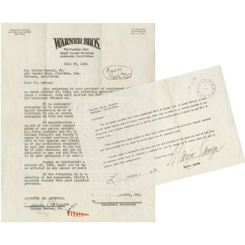 <B>Enrico Caruso Jr. and Mario Lanza Signed Documents.</B></I> An employment agreement on Warner Bros. letterhead dated July 27, 1934, and signed by Caruso Jr. in black ink. Also included is a payment authorization form dated January 1, 1955, signed by Lanza in black ink. Items are in overall Very Fine condition with some tanning and fold creases to the Caruso contract.<I>Accompanied by LOA from PSA/DNA.</B></I><BR><BR><b>Shipping:</b> Flat Material, Small (<a target="_blank" href="http://www.heritageauctions.com/common/shipping.php">view shipping information</a>)
