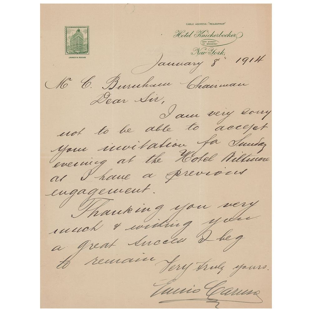 LS, one page, 8 x 10.5, Hotel Knickerbocker letterhead, January 8, 1914. Letter to Charles Burnham, chairman of the Actors' Fund Fair. In part: "I am very sorry not to be able to accept your invitation for Sunday evening at the Hotel Biltmore as I have a previous engagement. Thanking you very much & wishing you a great success." In fine condition.