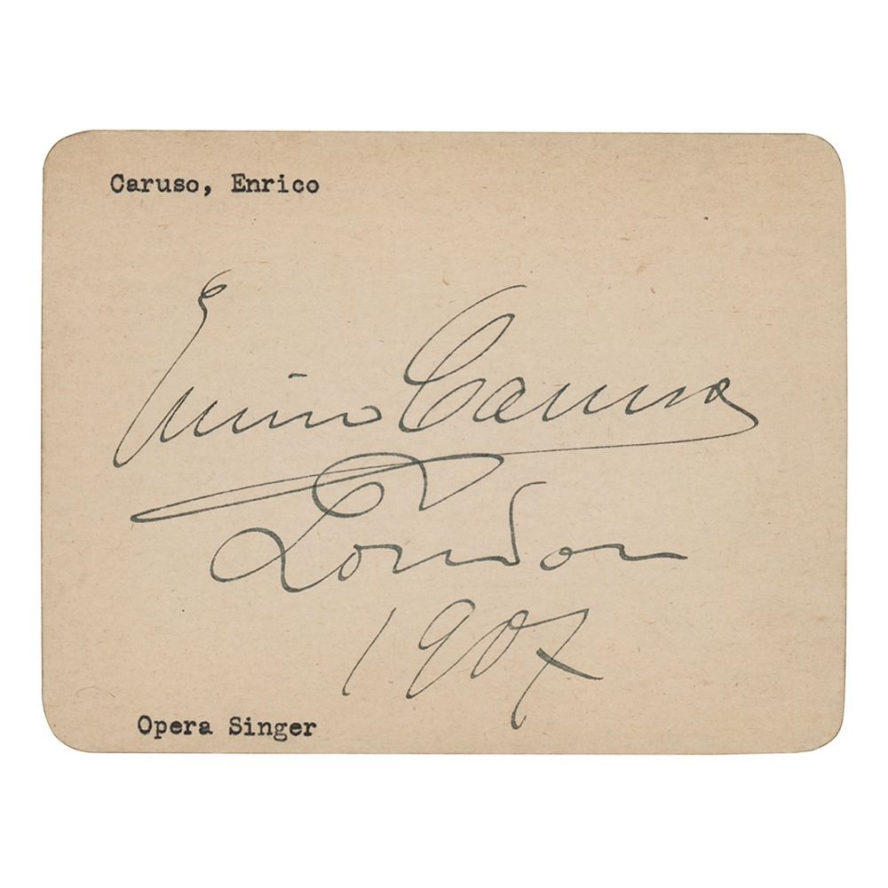 Vintage fountain pen signature, "Enrico Caruso, London, 1907,” on an off-white 4.5 x 3.5 card. In very fine condition.