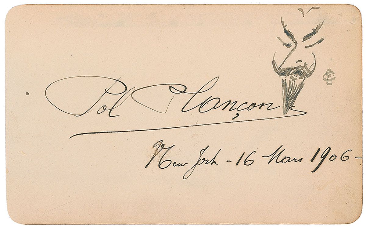 Original vintage ink caricature sketch of Plancon, drawn by Caruso on an off-white 6.5 x 4 album page, and initialed “EC,” next to the sketch, and signed underneath, “Pol Plancon, New York, 16 Mars 1906.” The date added by Plancon was the day he and Caruso appeared together in Ponchielli’s La Gioconda at the Met, Caruso as Enzo, Plancon as Alvis. Some scattered light toning and soiling, otherwise fine condition.