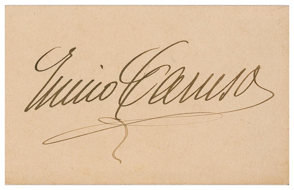 Vintage fountain pen signature, “Enrico Caruso,” on an off-white 3.25 x 2 card. A uniform shade of toning, otherwise fine condition.