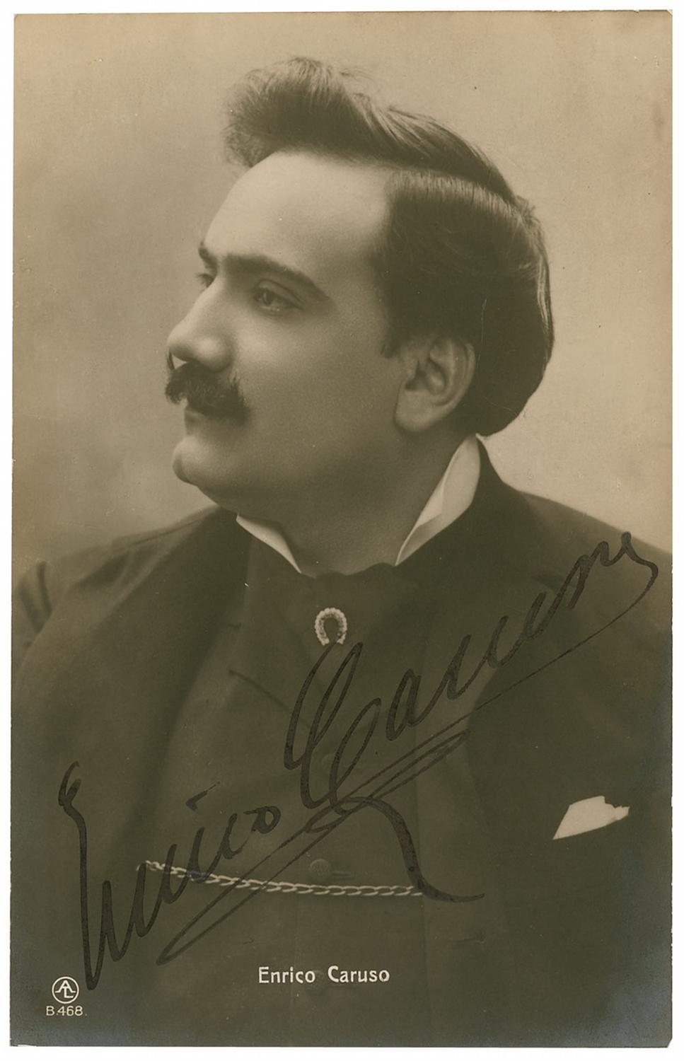 Vintage 3.5 x 5.5 postcard photo of Caruso in profile, signed in fountain pen. A few spots of soiling and mild silvering to the darker areas of the bottom corners, otherwise fine condition.