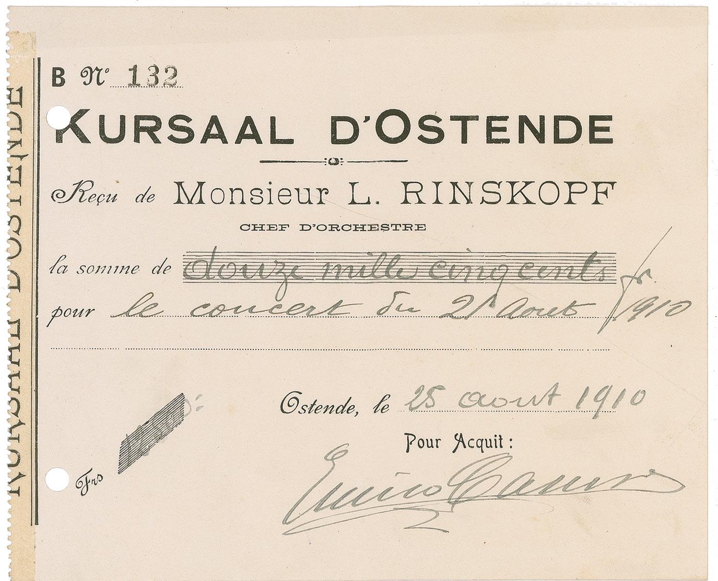 DS, in French, one page, 6 x 5, August 25, 1910. receipt for a payment of 12,500 francs from the Kursaal D’Ostende’s L. Rinskopf for a concert given on August 21, 1910. Signed at the bottom in fountain pen by Caruso. Central vertical fold through a single letter of signature, a bit of scattered light soiling, and two punch holes to left side, otherwise fine condition.