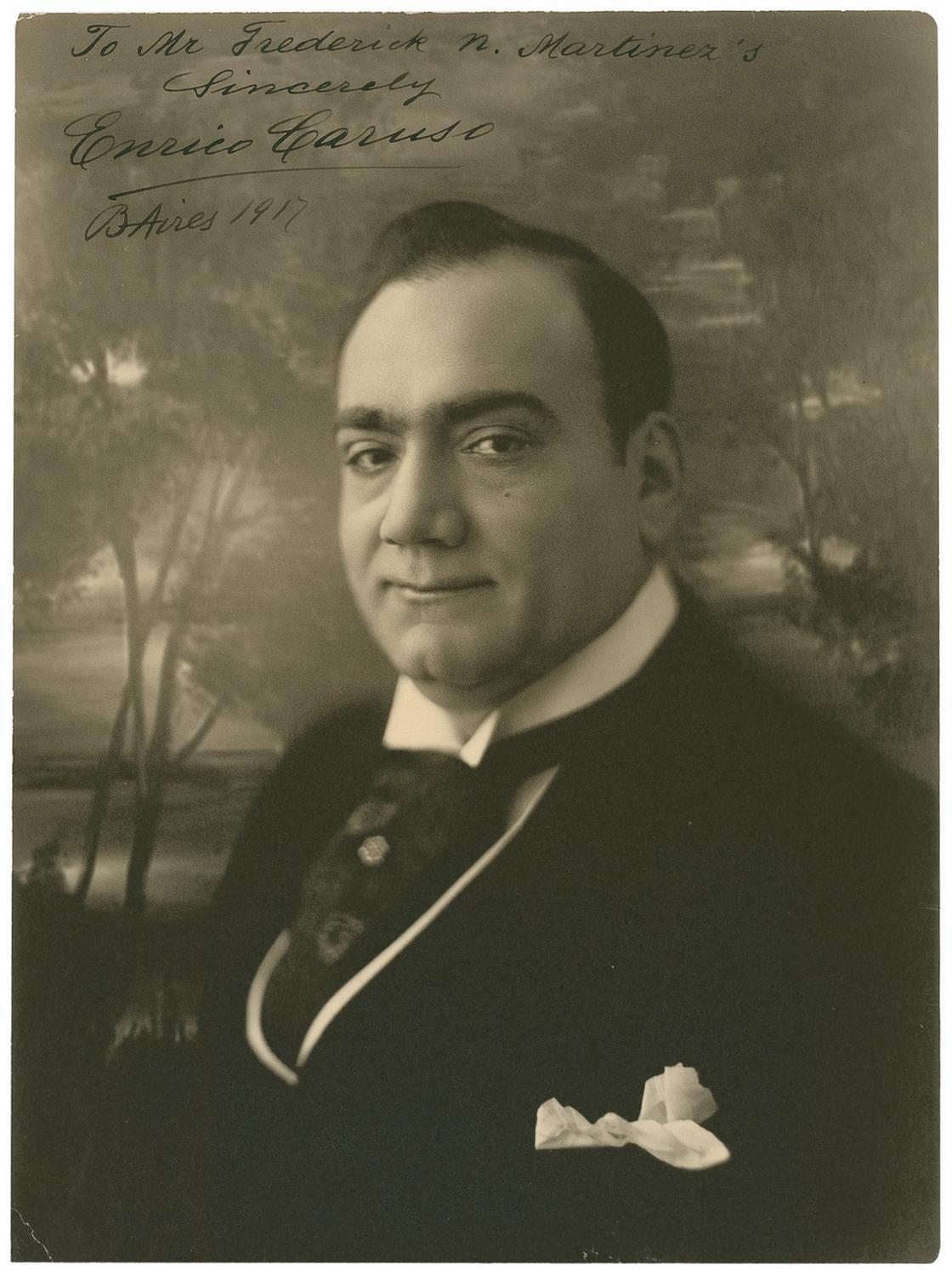 Vintage matte-finish head-and-shoulders photo, trimmed to a size of 8.25 x 11.25 , signed and inscribed in fountain pen “To Mr. Frederick N. Martinez’s, Sincerely, Enrico Caruso, B. Aires 1917.” In fine condition, with a few light edge and corner creases. Caruso performed at the Teatro Colon in Buenos Aires, Argentina, in 1917, for a performance of Leoncavallo´s opera ‘Pagliacci.’ Caruso performed in the role of Canio, his signature role. This was the last performance he made of Pagliacci in Argentina.