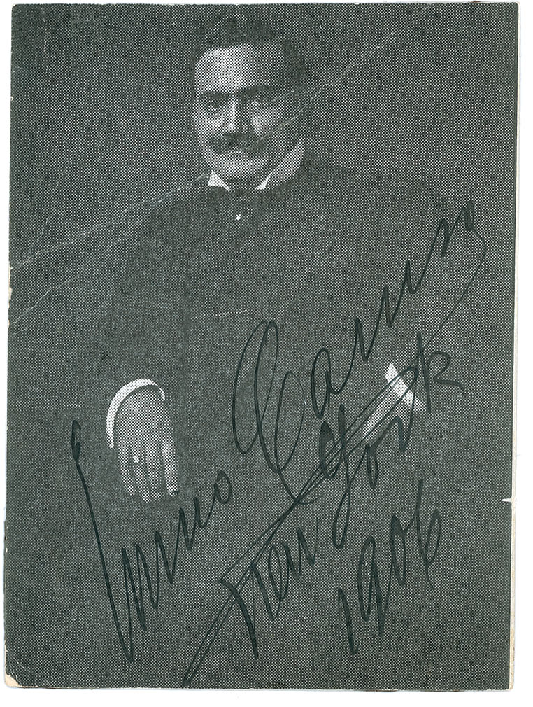 Vintage 3.75 x 5 cardstock portrait of Caruso near the start of his career, signed in black ink “Enrico Caruso, New York 1906.” In very good condition, with bends and creases passing through his face, and mounting remnants on the reverse.