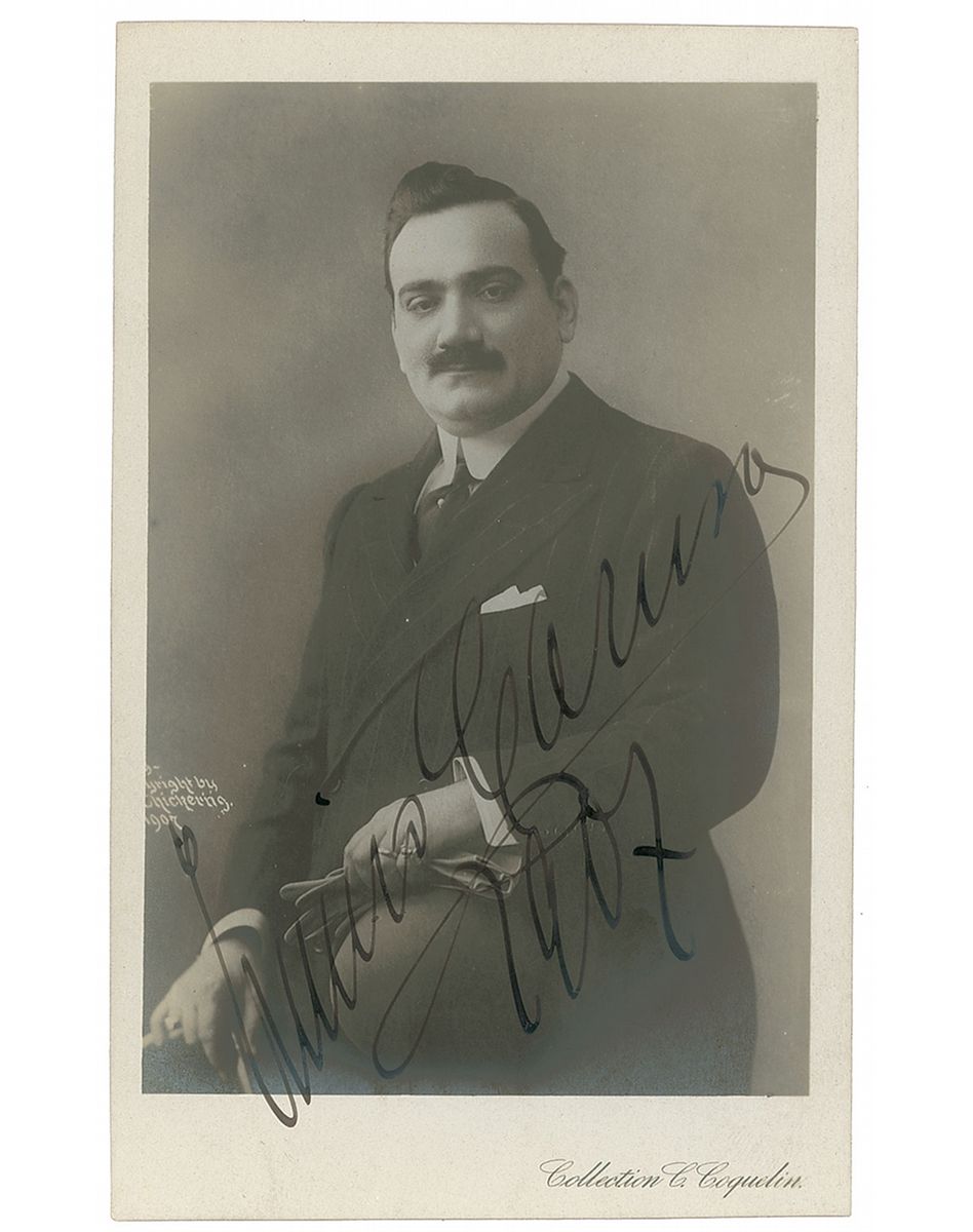 Vintage 3.25 x 5.5 postcard photo, signed in fountain pen, “Enrico Caruso 1907.” In very good condition, with moderate silvering to some darker portions of image, not detracting from the large and bold signature.