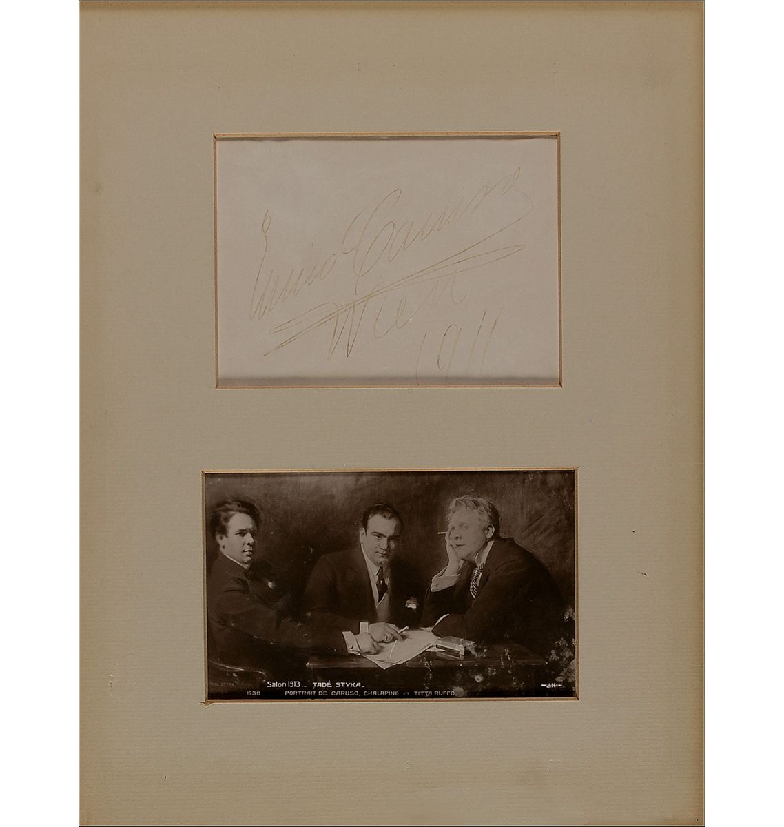 Vintage fountain pen signature, “Enrico Caruso, Wein 1911,” on an off-white album page. Matted with a postcard photo of Caruso with Chalapine and Titta Ruffo to an overall size of 9 x 12. In very good condition, with signature uniformly faded, but still completely legible, and toning to mat.