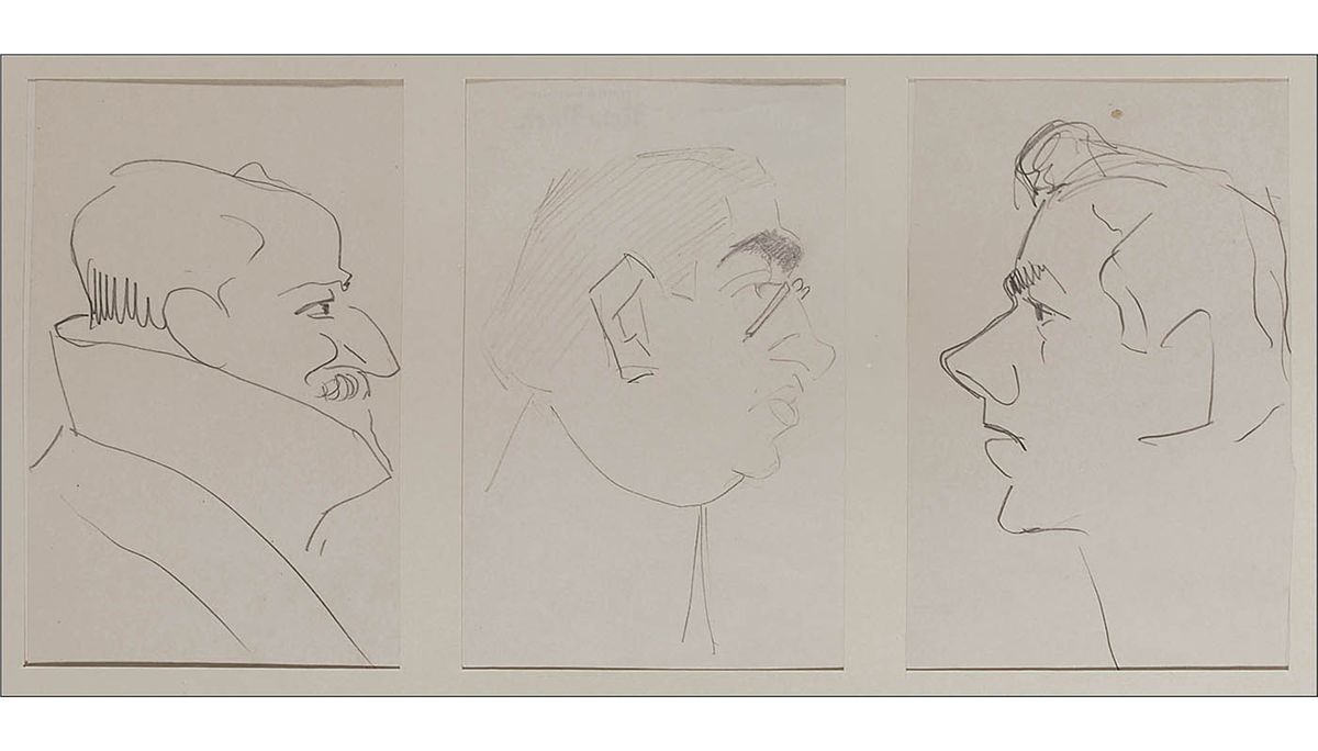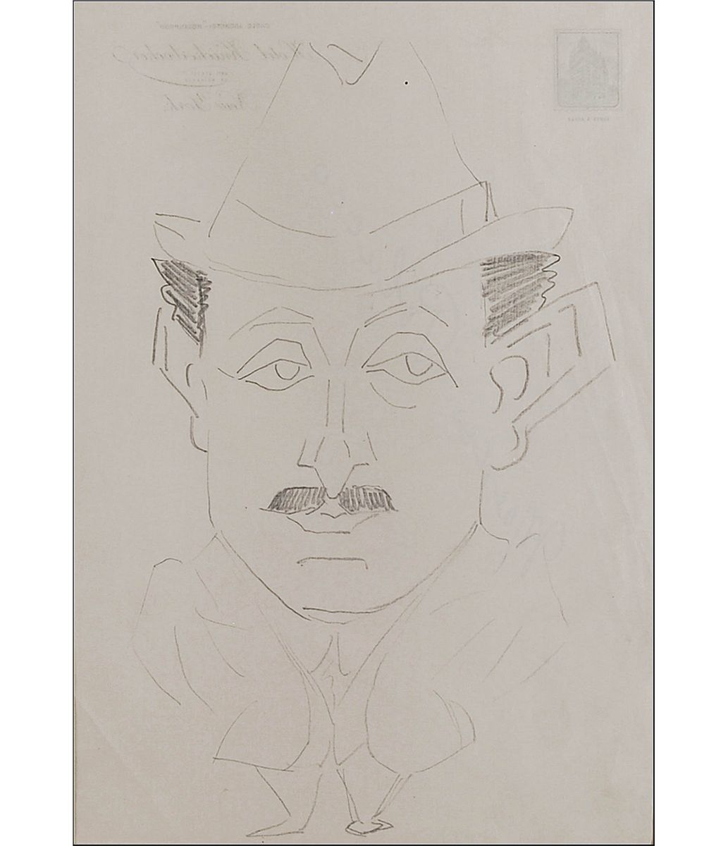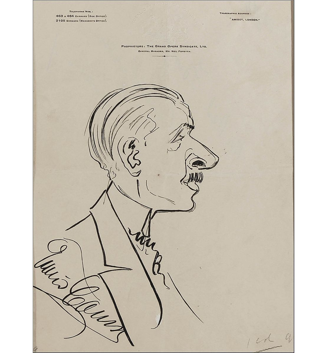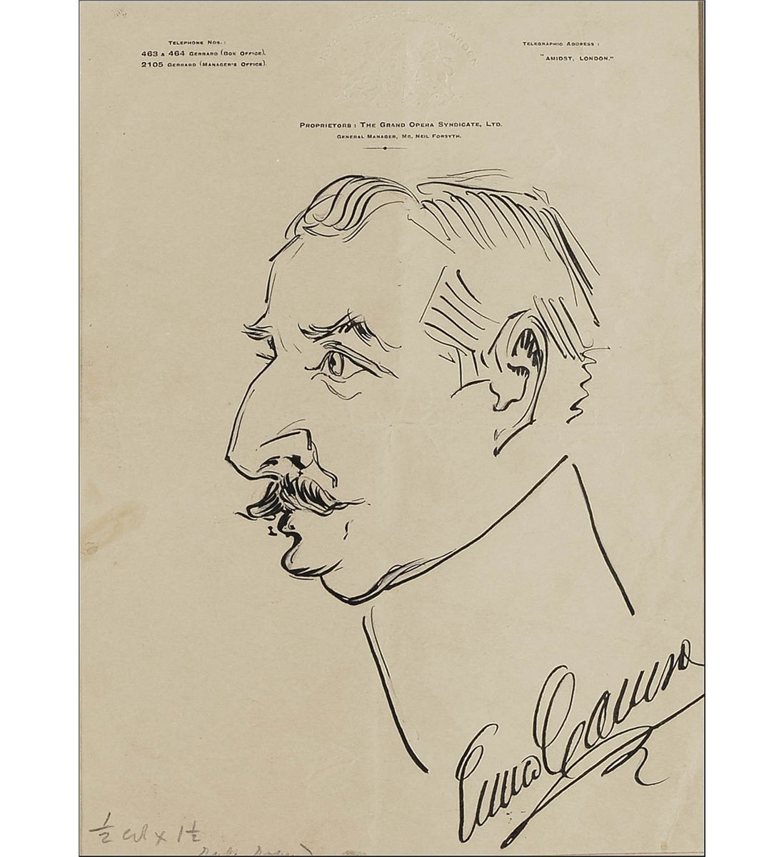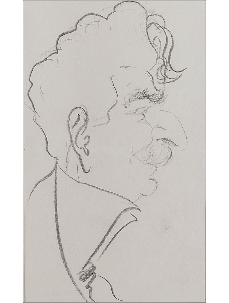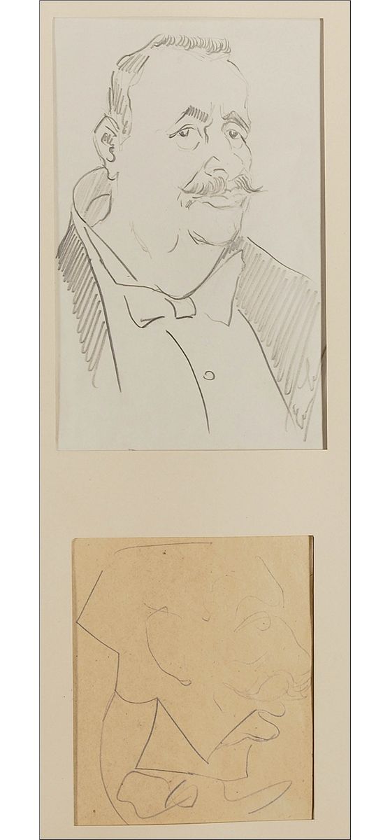Remarkably unique custom-bound hardcover album, 15.5 x 19.5, containing 44 caricature drawings by Enrico Caruso. Each drawing—31 in pencil or graphite and the remainder in ink, crayon, or pencil traced over in ink—has been sleeved into a mat, and the mat sheets bound into the album. The drawings range in size from approximately 7.75 x 4 to 12 x 8.5. Sketches primarily feature portraits of men in profile, but also include men in formal wear, a clown figure, a singer in a Shakespearean costume, an abstract sketch, a person in manacles, a woman in profile, and a self-portrait. Two sketches signed “Enrico Caruso” and three signed on the reverse, one “E. Caruso” and the others “Enrico Caruso.” Sixteen items bear show-through from the reverse of either numbers, dates, initials, or possible signatures. In fine condition, with scattered light toning to the pages, one mat page loose, and some wear to the gilt lettering. The album was once housed within a secondary cover, with the spine and front board detached and the back board barely attached.