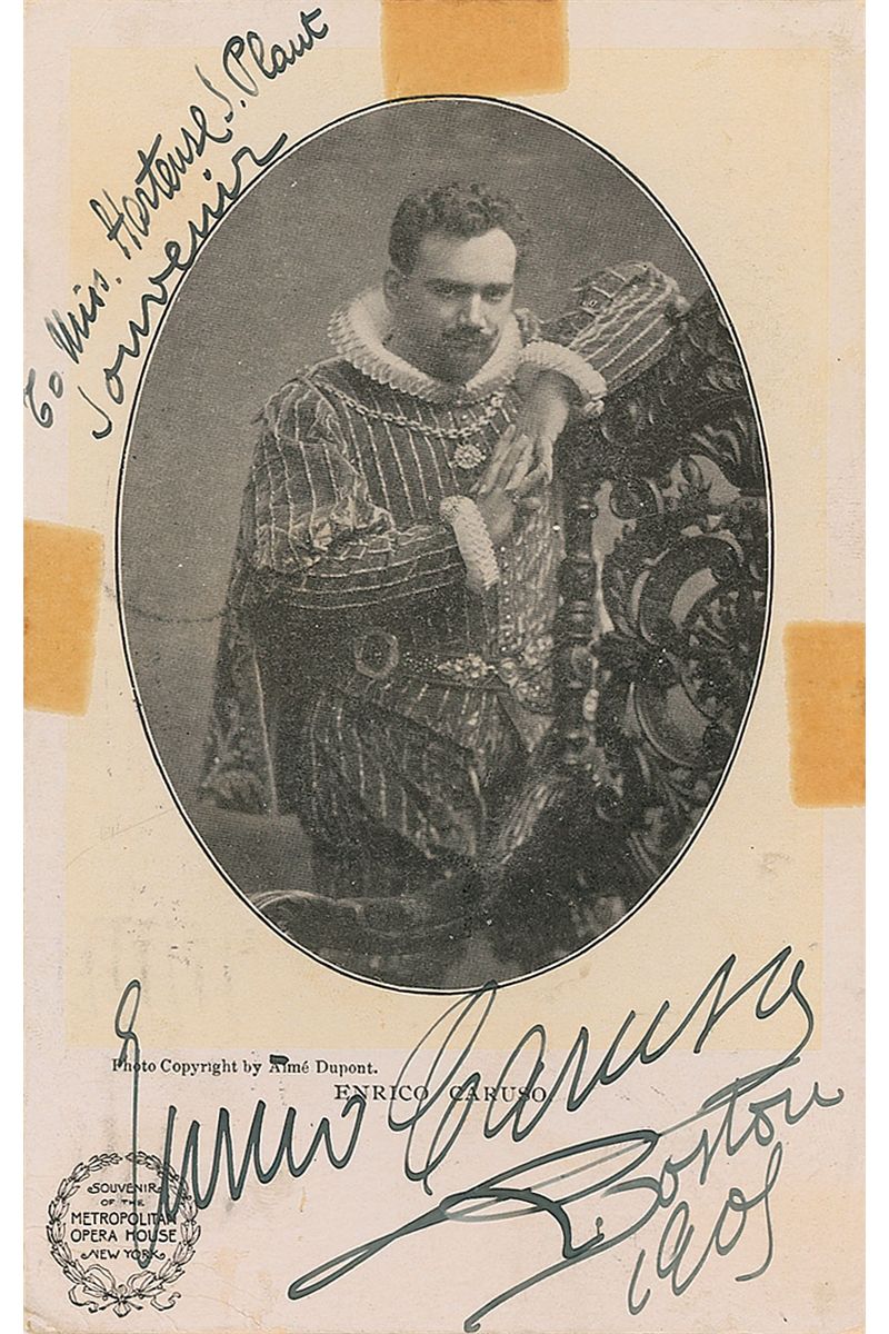 Vintage 3.5 x 5.5 postcard photo of Caruso in costume, signed and inscribed in fountain pen “To Miss Hortense S. Plant, souvenir, Enrico Caruso, Boston 1904.” In fine condition, with three small blocks of toning to edges and mounting remnants to reverse.