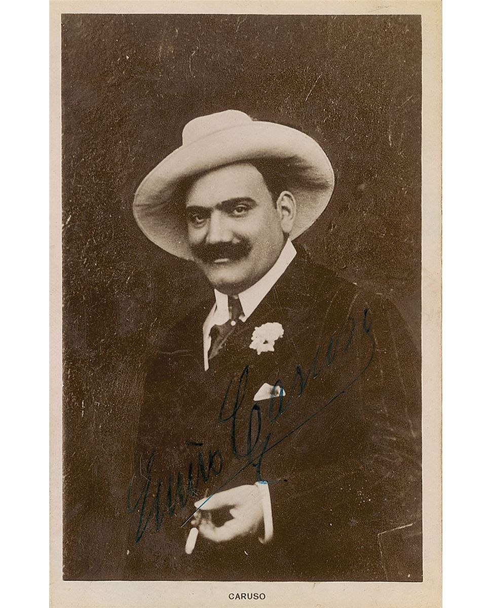 Vintage glossy 3.25 x 5.25 photo of Caruso in a white Fedora, signed in fountain pen. Photo is affixed to the closing of a letter, dated June 1913, which is affixed to a 7 x 6 album page. In very good condition, with light to moderate contrast to signature, and scattered surface marks.