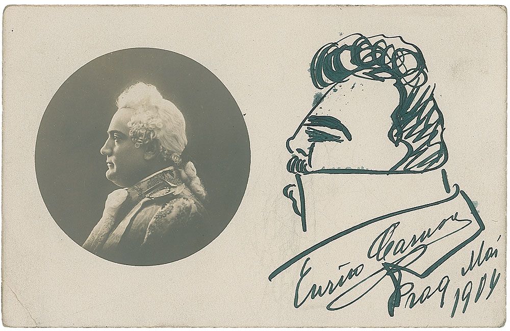 Original vintage signed self-portrait fountain pen sketch of the tenor in a profile head-and-shoulders pose with a large collar on a 5.5 x 3.5 French postcard with a circular inset image of Caruso in a profile pose in costume as Chevalier des Grieux from Giacomo Puccini's opera Manon Lescaut, signed under the image, “Enrico Caruso, Prague, May 1904.” In fine condition, with a small crease to lower left corner tip.