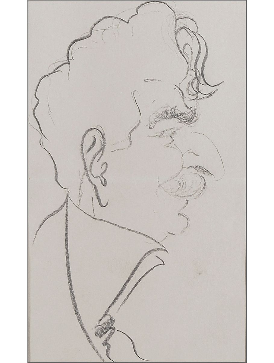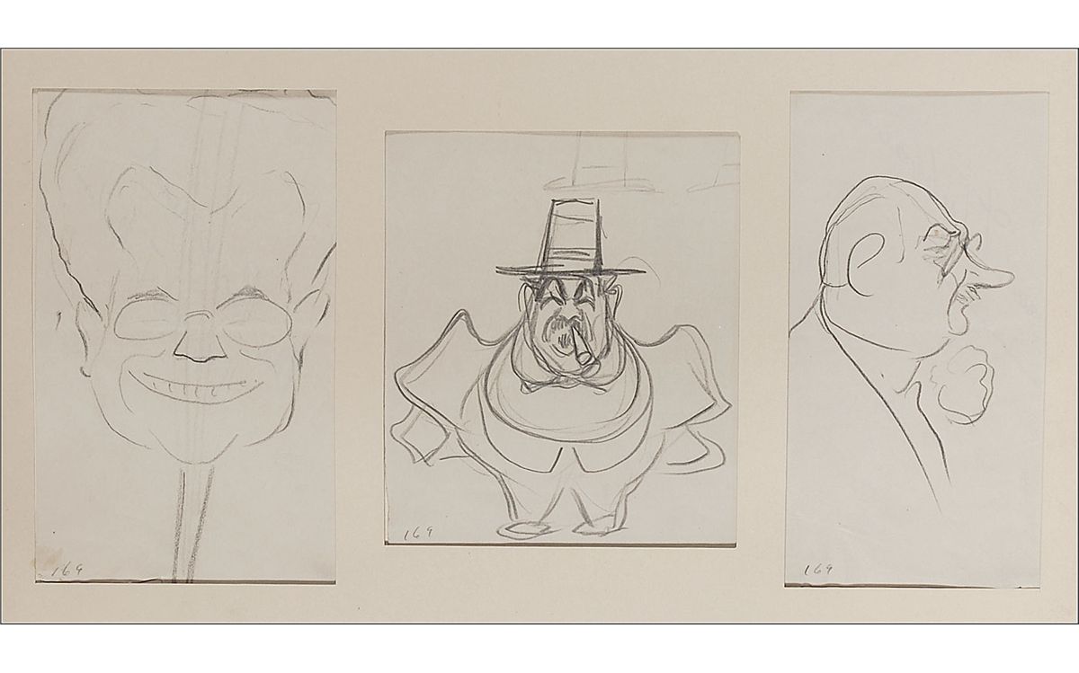 Remarkably unique custom-bound hardcover album, 15.5 x 19.5, containing 44 caricature drawings by Enrico Caruso. Each drawing—31 in pencil or graphite and the remainder in ink, crayon, or pencil traced over in ink—has been sleeved into a mat, and the mat sheets bound into the album. The drawings range in size from approximately 7.75 x 4 to 12 x 8.5. Sketches primarily feature portraits of men in profile, but also include men in formal wear, a clown figure, a singer in a Shakespearean costume, an abstract sketch, a person in manacles, a woman in profile, and a self-portrait. Two sketches signed “Enrico Caruso” and three signed on the reverse, one “E. Caruso” and the others “Enrico Caruso.” Sixteen items bear show-through from the reverse of either numbers, dates, initials, or possible signatures. In fine condition, with scattered light toning to the pages, one mat page loose, and some wear to the gilt lettering. The album was once housed within a secondary cover, with the spine and front board detached and the back board barely attached.