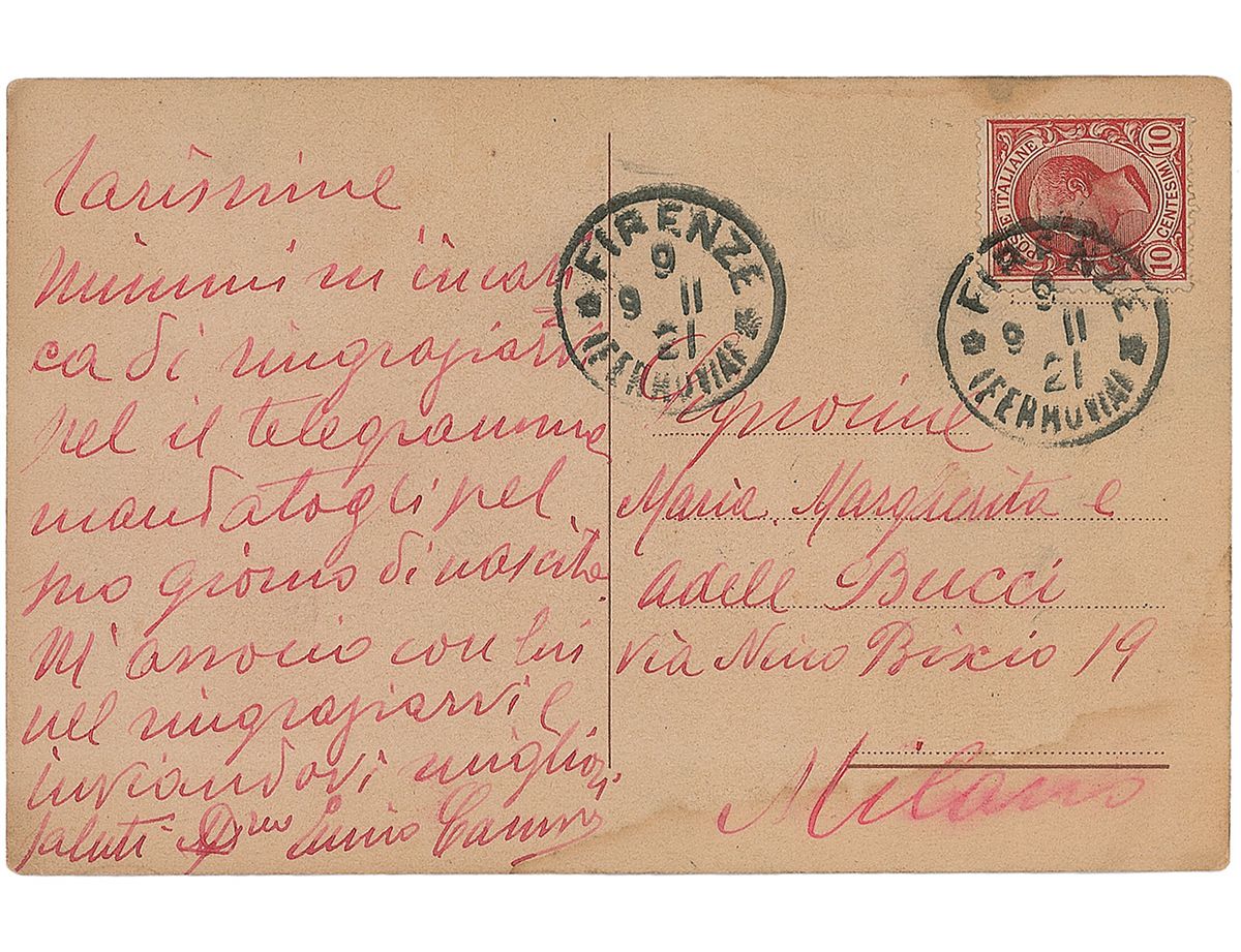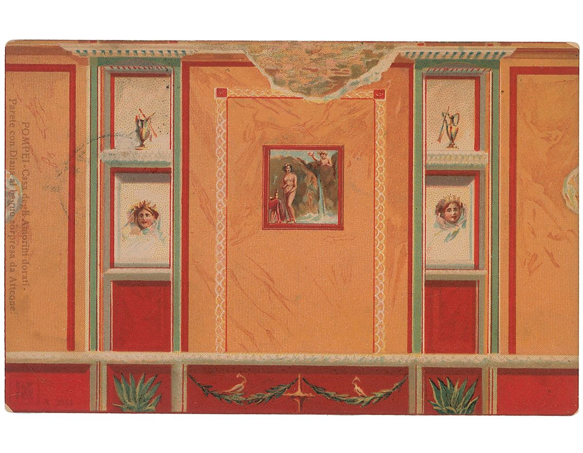 Untranslated ALS in Italian, one page on a 5.5 x 3.5 postcard depicting the interior of Pompei’s Casa degli Amorini Dorati. Dampstaining to the lower right (just below but not affecting the signature), otherwise fine condition.