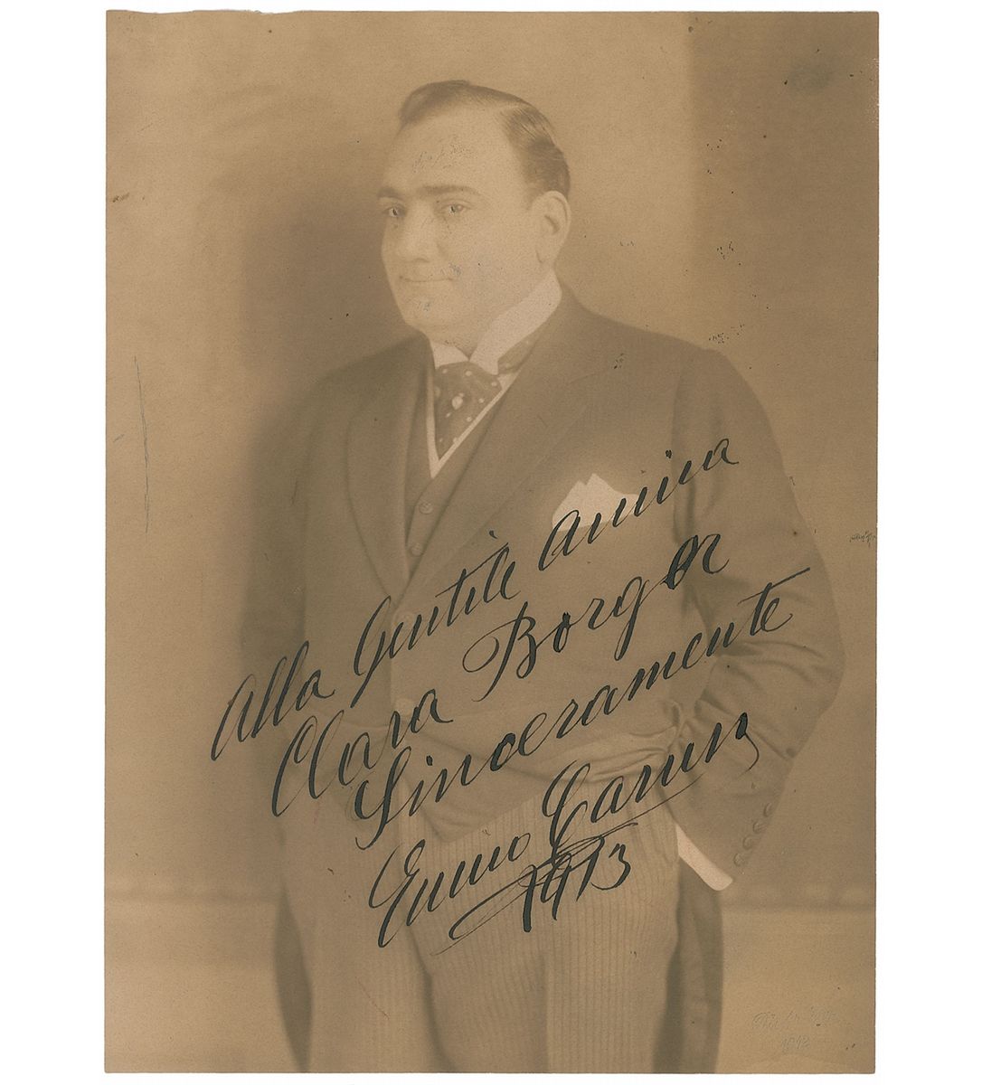 Superb matte-finish 6.25 x 8.5 photo, very boldly signed and inscribed in black ink, “Alla gentile amica Clara Borger, Sinceramente, Enrico Caruso, 1913.” In fine condition.