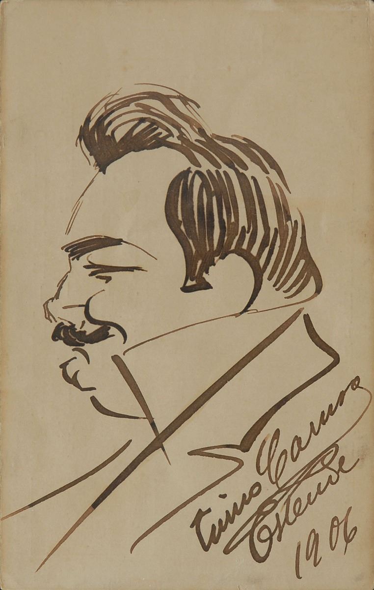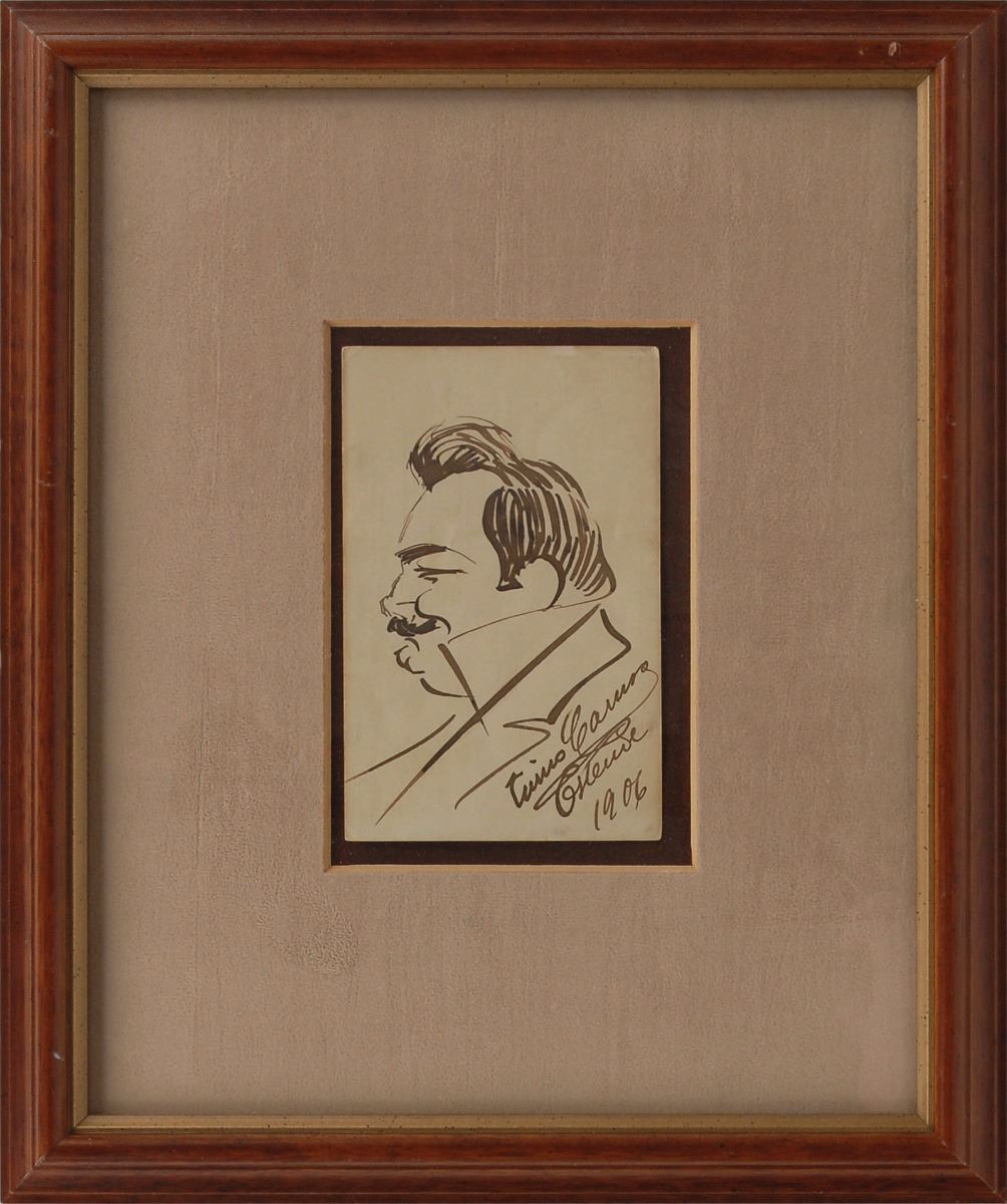 Wonderful original bold ink self-portrait on an off-white 3.5 x 5.5 card, signed in the lower right and dated 1906. Mounted, matted, and framed. In fine condition.
