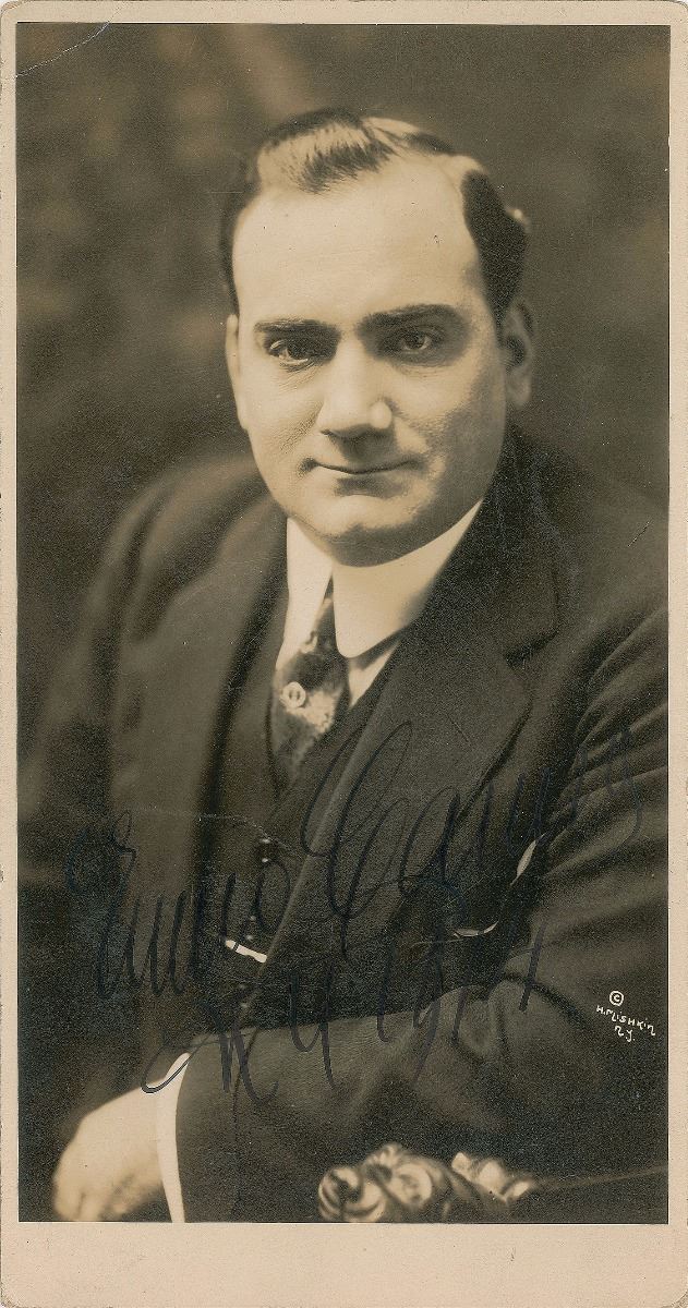 Striking matte-finish 5.25 x 9.75 photo of Caruso by Herman Mishkin of New York, signed in black ink, "Enrico Caruso, NY 1911." In fine condition, with a few creases and some light silvering. An unusual size for this desirable format. Pre-certified PSA/DNA.