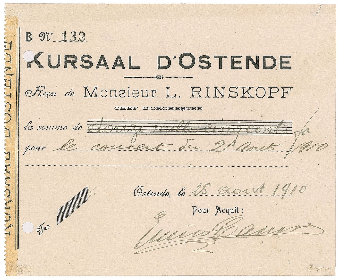 Partly-printed DS in French, one page, 6 x 5, August 25, 1910. Payment receipt from the Kursaal d'Ostende for "the concert of 21 August 1910," neatly signed at the conclusion by Caruso. In fine condition, with two file holes to the left edge and tape remnants to the reverse.