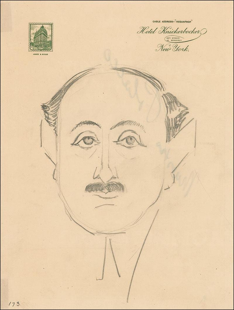 Original unsigned vintage signed pencil sketch of an unknown gentleman in a high collar on an off-white 8 x 10.5 sheet of Hotel Knickerbocker stationery. A bisecting horizontal fold, a few light creases, and tape mounting remnants to reverse of left edge, otherwise fine condition. Accompanied by an ornate dinner menu from the hotel, dated November 7, 1917. Pre-certified PSA/DNA and RRAuction COA.