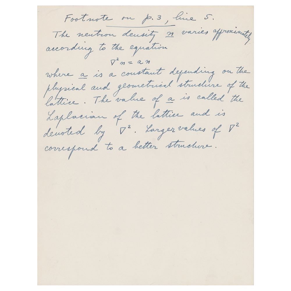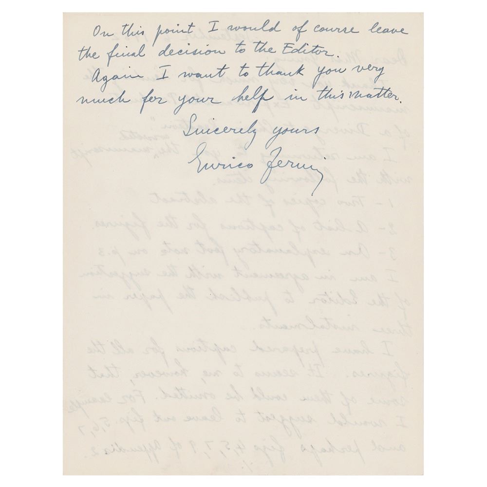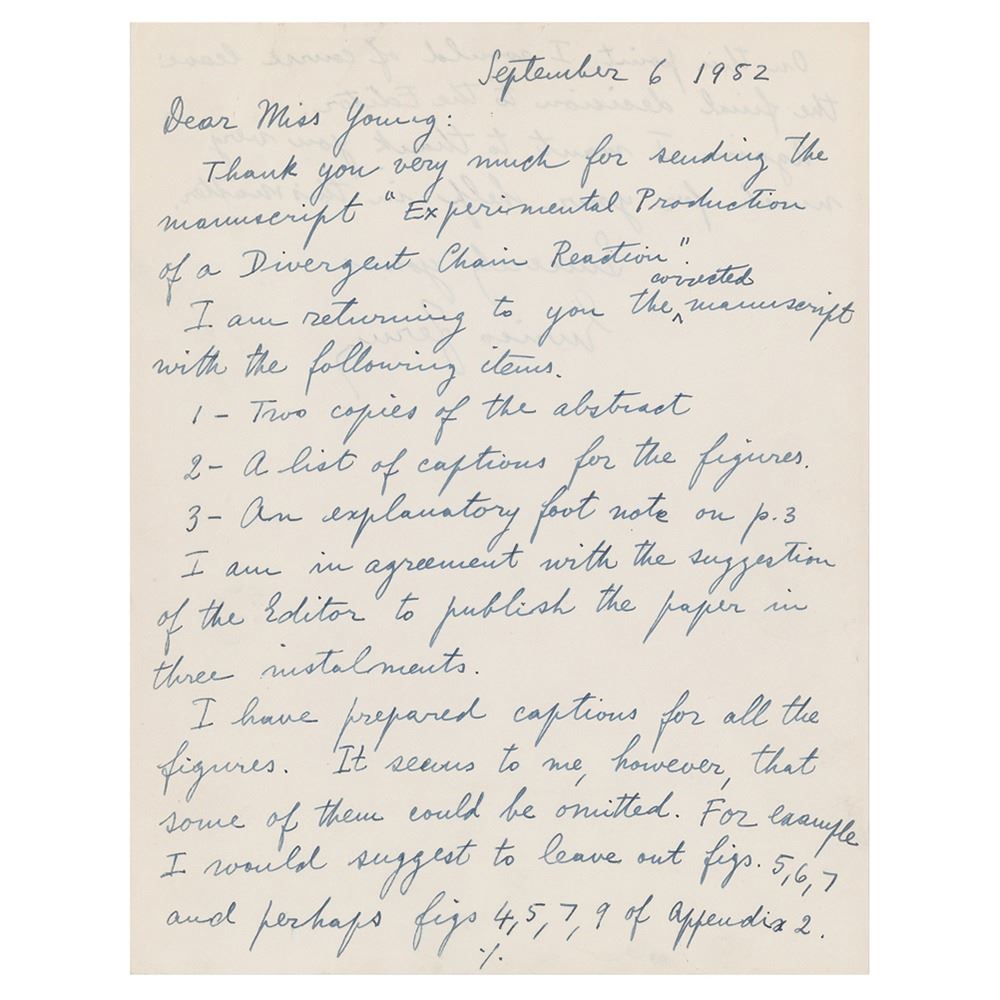 ALS, one page, both sides, 8.5 x 11, September 6, 1952. Handwritten letter to Miss Young, in full: "Thank you very much for sending the manuscript 'Experimental Production of a Divergent Chain Reaction.' I am returning to you the corrected manuscript with the following items. 1—Two copies of the abstract, 2—A list of captions for the figures, 3—An explanatory footnote on p. 3. I am in agreement with the suggestion of the Editor to publish the paper in three instalments. I have prepared captions for all the figures. It seems to me, however, that some of them could be omitted. For example I would suggest to leave out figs. 5, 6, 7 and perhaps figs 4, 5, 7, 9 of appendix 2. On this point I would of course leave the final decision to the Editor. Again I want to thank you very much for your help in this matter.†Fermi has included an additional sheet headed “Footnote on p. 3, line 5,†which reads: “The neutron density n varies approximately according to the equation ∇2n = an where a is a constant depending on the physical and geometrical structure of the lattice. The value of a is called the Laplacian of the lattice and is denoted by ∇2. Large values of ∇2 correspond to a letter structure.†In fine to very fine condition.