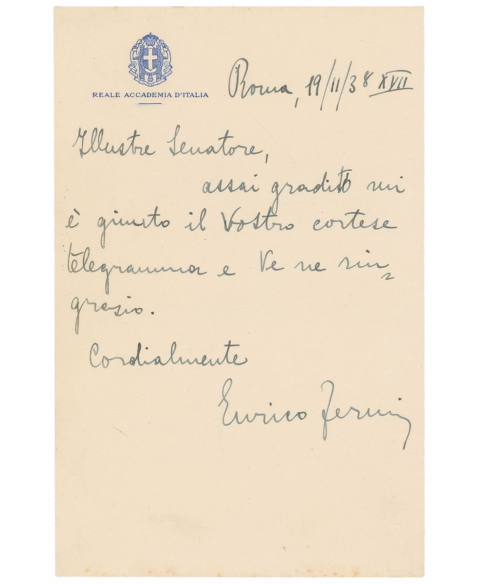 Scarce ALS in Italian, one page, 5 x 8, Reale Accademia d’Italia letterhead, November 19, 1938. Letter to an “illustrious senator,” thanking him for a telegram. In fine condition. Penned a month after Fermi’s selection as the Nobel Laureate in Physics was announced, this letter is most likely in response to one of the many congratulatory notes he received. For his discovery of ‘new radioactive elements produced by neutron irradiation, and for his related discovery of nuclear reactions brought about by slow neutrons,’ Fermi formally accepted the prize on December 10.