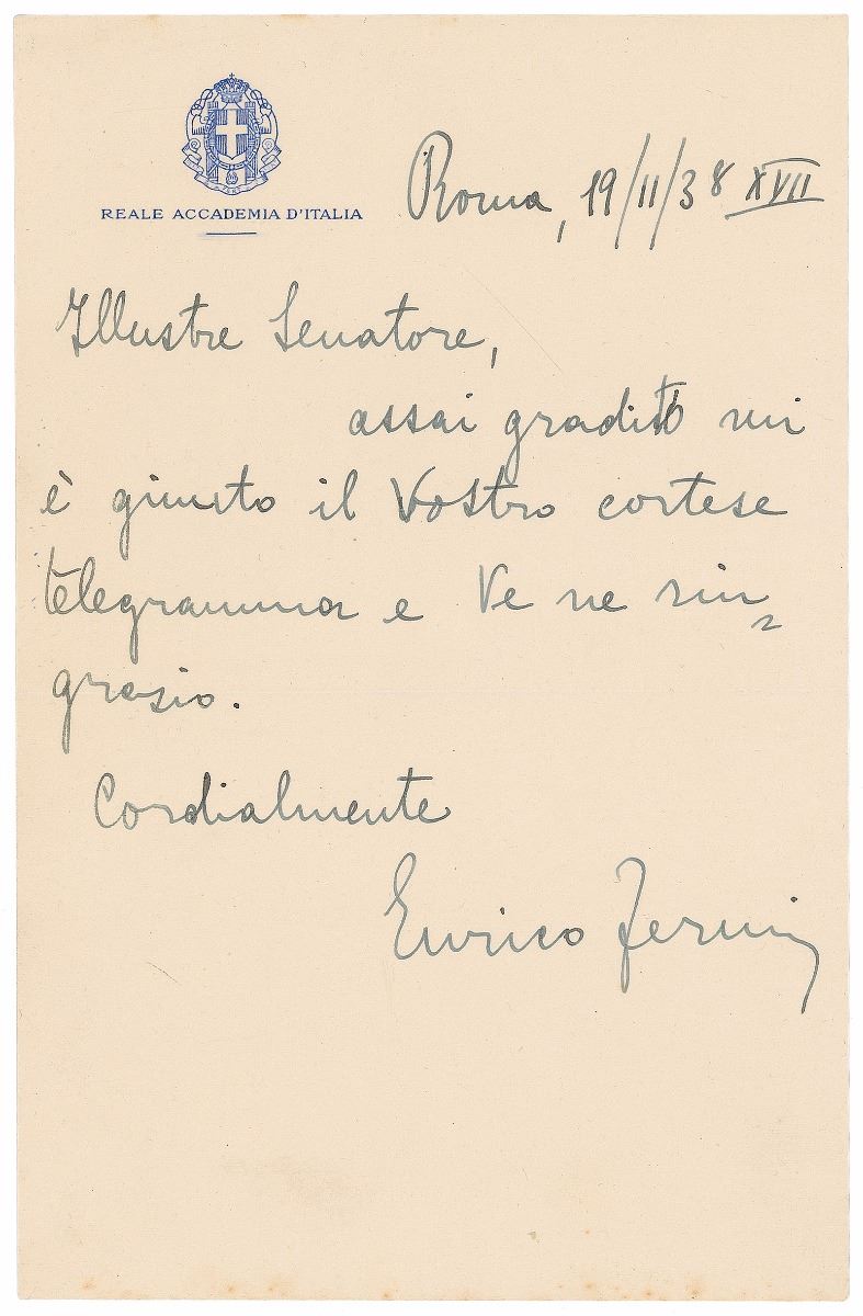 Scarce ALS in Italian, one page, 5 x 8, Reale Accademia d’Italia letterhead, November 19, 1938. Letter to an “illustrious senator,” thanking him for a telegram. In fine condition. Penned a month after Fermi’s selection as the Nobel Laureate in Physics was announced, this letter is most likely in response to one of the many congratulatory notes he received. For his discovery of ‘new radioactive elements produced by neutron irradiation, and for his related discovery of nuclear reactions brought about by slow neutrons,’ Fermi formally accepted the prize on December 10.