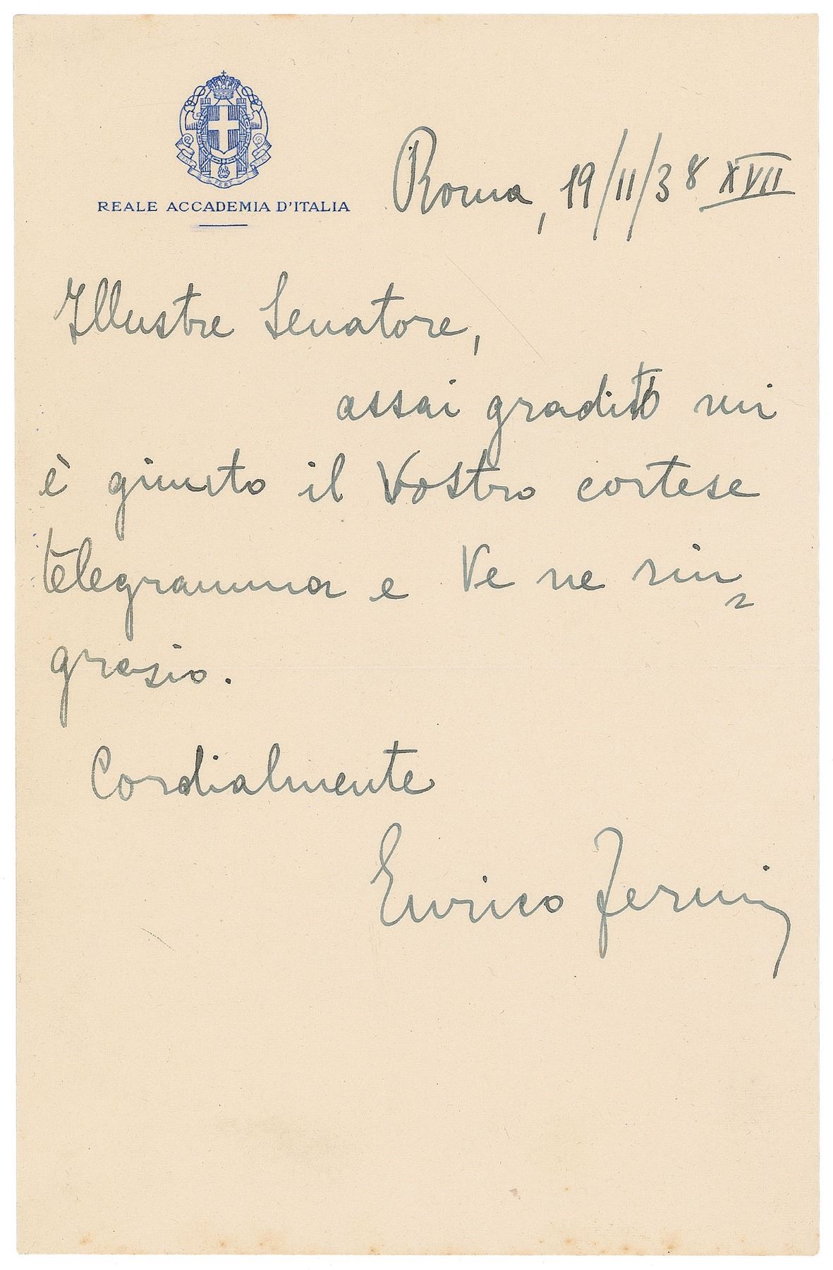 Scarce ALS in Italian, one page, 5 x 8, Reale Accademia d'Italia letterhead, November 19, 1938. Letter to an "illustrious senator," thanking him for a telegram. In fine condition. Penned a month after Fermi's selection as the Nobel Laureate in Physics was announced, this letter is most likely in response to one of the many congratulatory notes he received. For his discovery of 'new radioactive elements produced by neutron irradiation, and for his related discovery of nuclear reactions brought about by slow neutrons,' Fermi formally accepted the prize on December 10.