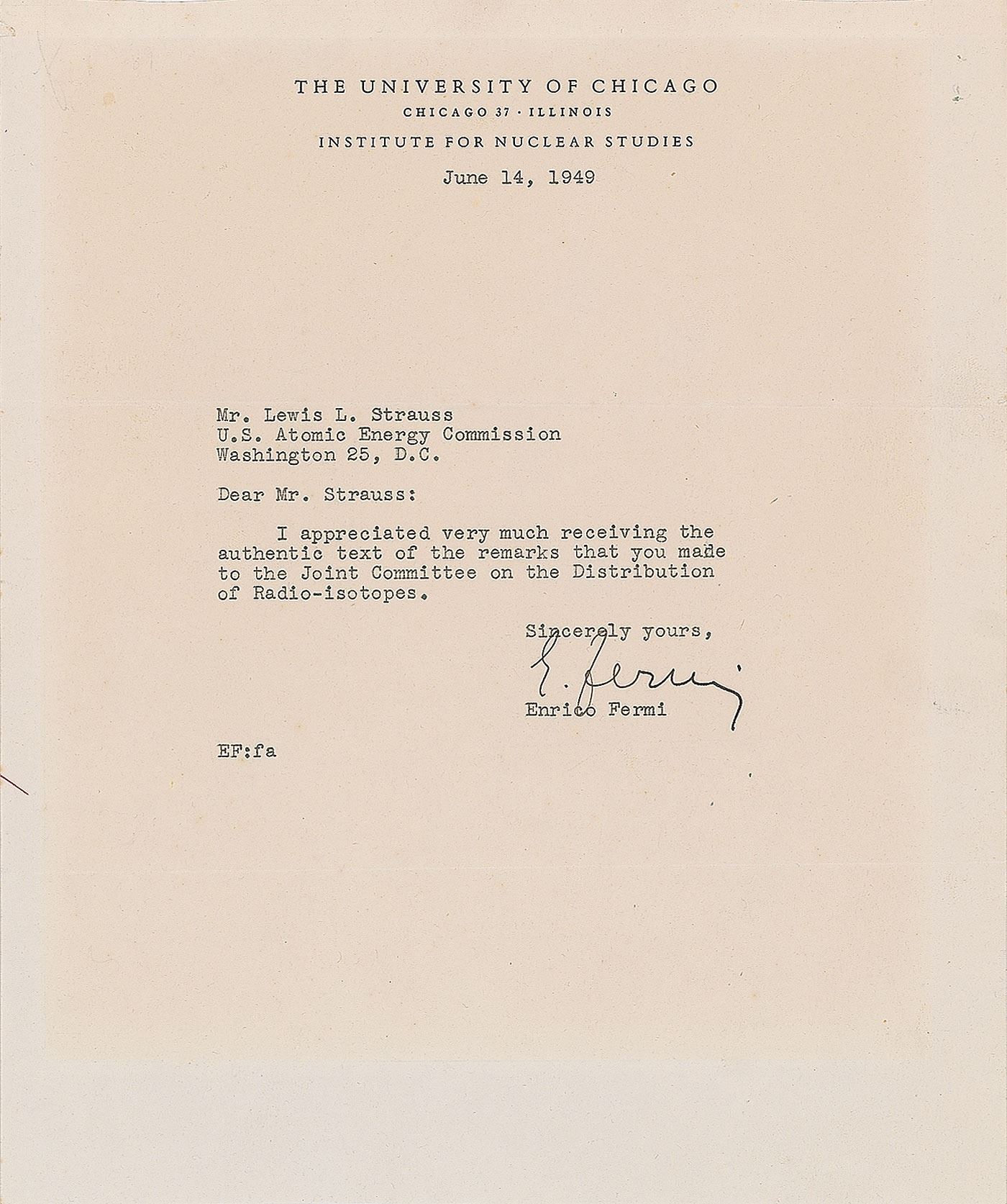 Physicist (1901–1954) who became the first to split the atom and was awarded the Nobel Prize for Physics in 1938 for his developments in harnessing nuclear power. TLS signed “E. Fermi,” one page, 8.5 x 10.25, The University of Chicago letterhead, June 14, 1949. Letter to Lewis L. Strauss of the US Atomic Energy Commission, in full: "I appreciated very much receiving the authentic text of the remarks that you made to the Joint Committee on the Distribution of Radio–Isotopes." In fine condition, with trimmed top and bottom edges, and a faint block of toning from prior display. Strauss would later be the driving force in the controversial 1954 hearings in which J. Robert Oppenheimer's security clearance was revoked. Fermi, who had worked on the Manhattan Project under Oppenheimer, was among the scientists who testified on his behalf.