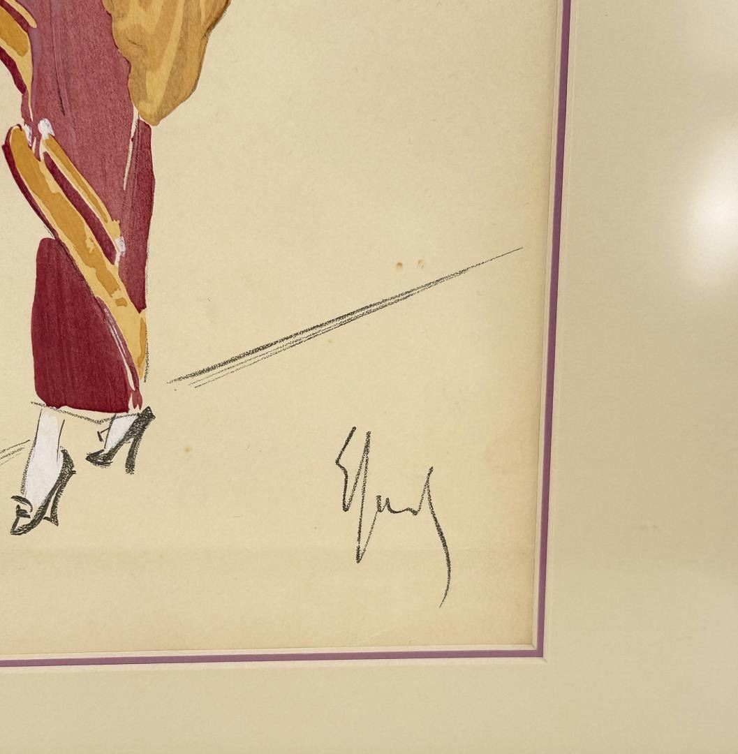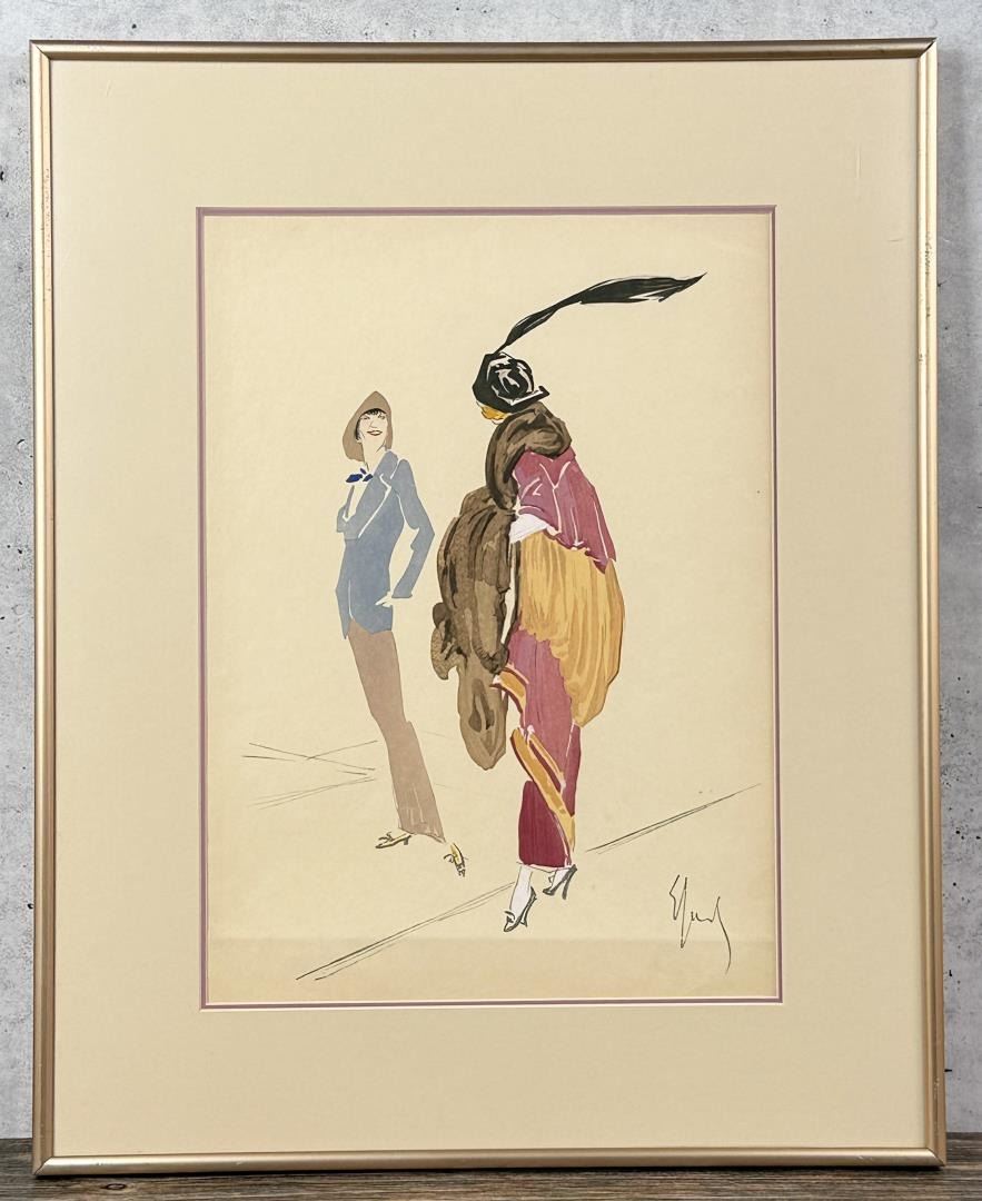 Title is Robes et Femmes Ladies of High French Fashion No. 3. Featured in the 1913 catalog. 10 1/2" by 14 1/2" unframed.16 3/4" by 20 3/4" framed. Gouache on Paper. From the Private Collection of James H and Pauline Harken. Inventory #991 Enrico Sacchetti (1874 - 1960) was active/lived in Italy. Enrico Sacchetti is known for Painting. Enrico Sacchetti was born in Rome in 1877. He was an illustrator and fashion designer, who made his fortune in Paris. He created sharp faced, angular depictions of the new woman who was a modern, economically independent and cosmopolitan ?gure. The re?ned aesthetic of this elegant new woman was expertly captured by the artist's hand. At the outbreak of the First World War, he returned to Italy, where he worked as a propaganda artist. He died in Settignano in 1967.