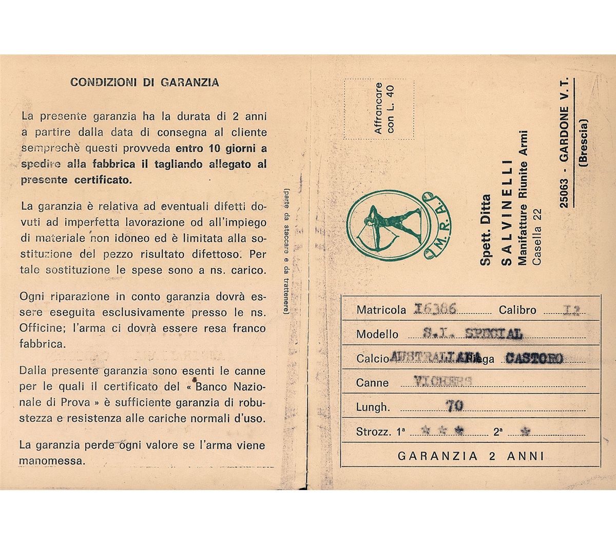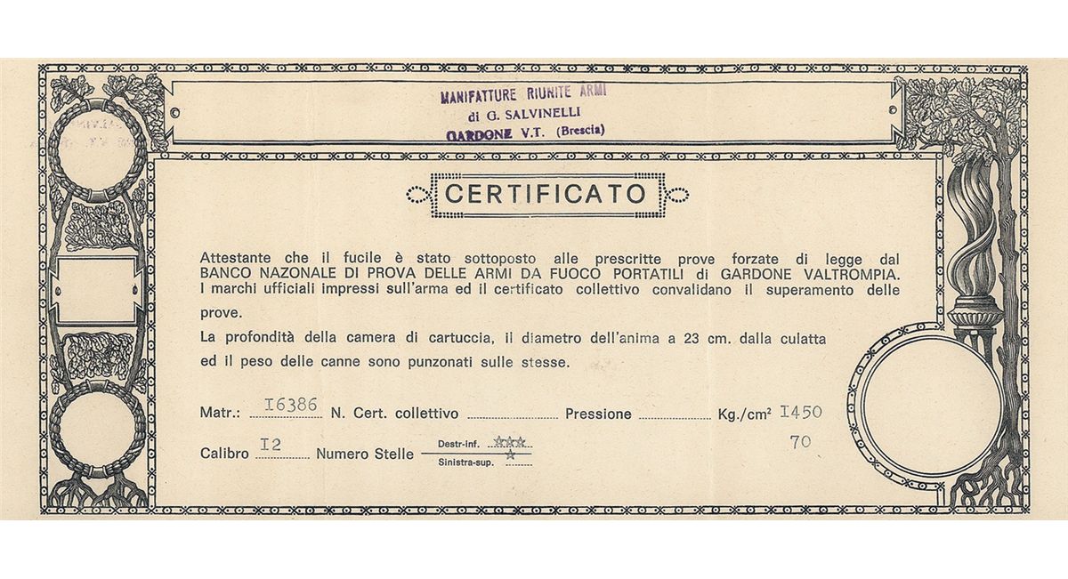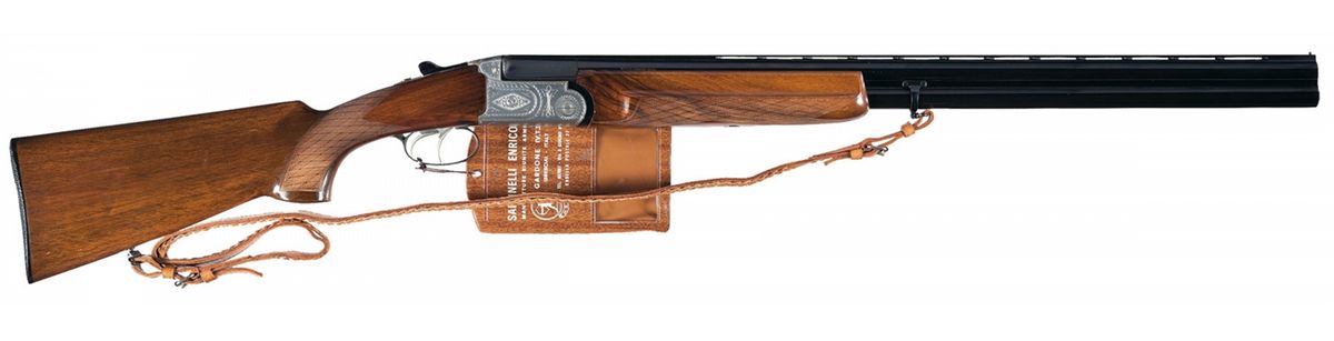 Manufactured in Italy. Single gold bead on the the matte vent rib. 2 3/4 inch chambers, choked extra full/full with extractors. The chamber area of the barrel is border engraved. Lightly floral and border engraved coin finished action with coin finished double triggers and tang mounted safety. Fitted with a walnut, skipline checkered finger grip forearm and pistol grip stock. Checkered plastic buttplate marked "MANIFATTURE REUNITE ARMI". Length of pull is 14 3/8 inches. Accompanied by a Certificate of Authenticity written in Italian. Complete with a strap and braid sling.