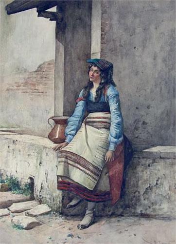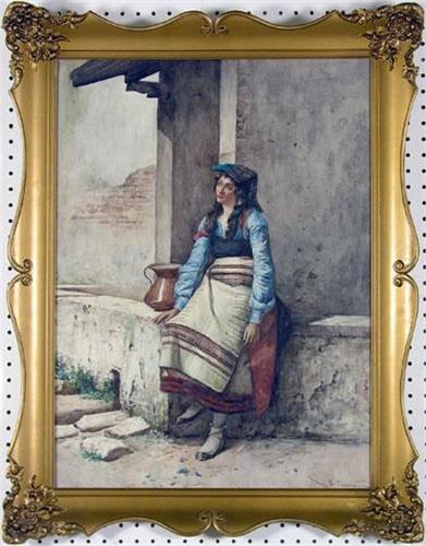 [Italian 1848-1938] UNTITLED; WOMAN SEATED ON A LOW WALL Watercolour on paper 26 3/4 x 19 3/4 ins. -Signed