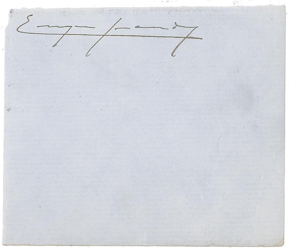Spanish Catalan pianist and composer of classical music most well known for Goyescas. He died tragically in 1916 when his boat was torpedoed by a German U-Boat. Vintage fountain pen signature, “Enrique Granados,” on a light blue 4 x 3.5 slip. In fine condition, with scattered light creasing and wrinkling.