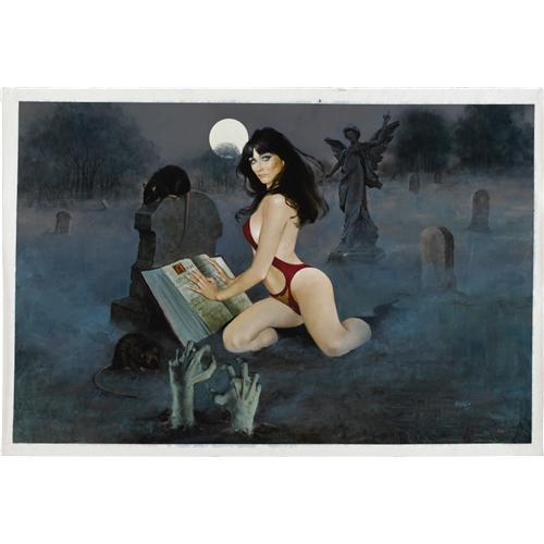 <B>Enrique Torres - Vampirella Painting Original Art (undated).</B></I> This portrait of Drakulon's favorite daughter, Vampirella, as she enjoys a good read in the graveyard, is sure to give her fans bone-chills! It's a sensational painting, created by one of her best-known cover artists, Enric. This captivating oil-on-canvas creation measures an overall 42.5" x 60". This gallery-style painting comes rolled, is in Excellent condition, and is ready to frame and display. The lucky winner of this piece will spend hours delighting in all the eerie color and detail!<BR><BR><b>Shipping:</b> Rolled (<a target="_blank" href="http://www.heritageauctions.com/common/shipping.php">view shipping information</a>)