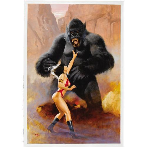 <B>Enrique Torres - "Vampirella and the Cave Beast" Painting Original Art (undated).</B></I> The world's most vivacious "vamp-ire," Vampirella, is spectacularly spotlighted on a colossal canvas by a magnificent master of "good girl" art, Enrique Torres, otherwise known to fandom as "Enric." One of the most celebrated Vampirella cover artists ever, Enric has continued to create many new delights showcasing the ever-popular Darling of Drakulon. This savage spectacular co-starring the carnivorous Cave Beast was painted with Enric's usual "classical approach," using rich, layered oil glazes to build up the final image. This unstretched oil on canvas masterwork has an overall size of 42.5" x 62.5", and is in Excellent condition. <BR><BR><b>Shipping:</b> Rolled Material (<a target="_blank" href="http://www.heritageauctions.com/common/shipping.php">view shipping information</a>)