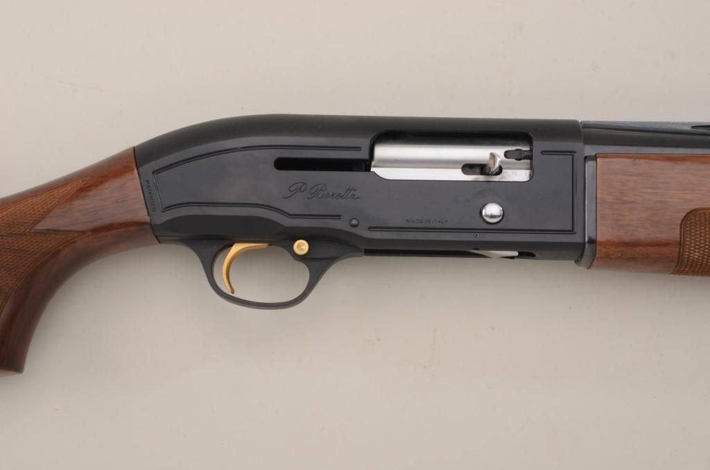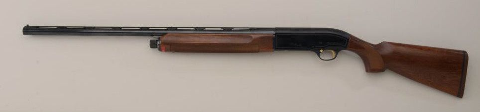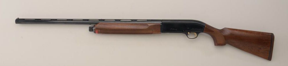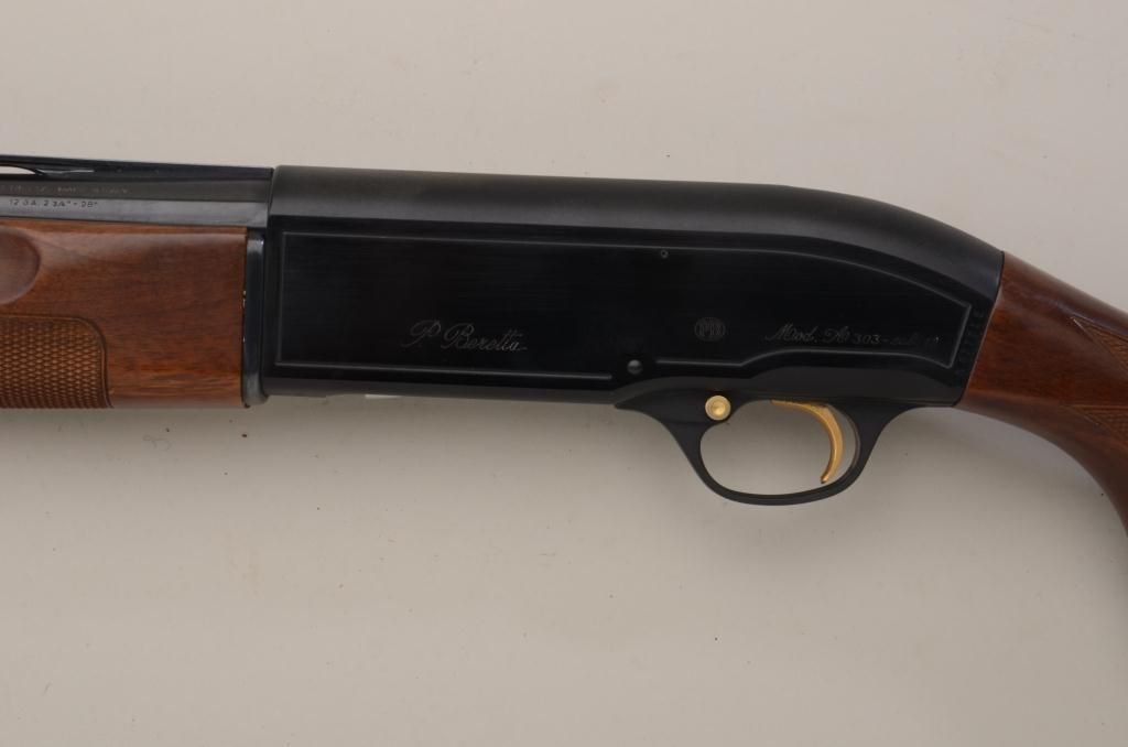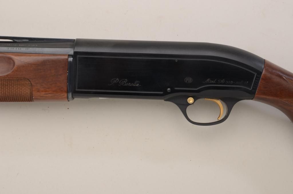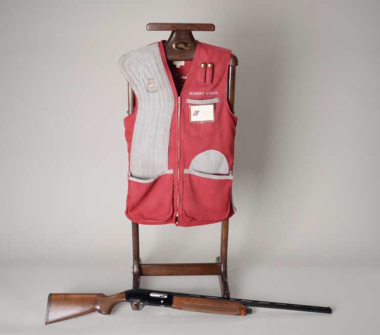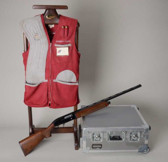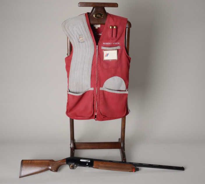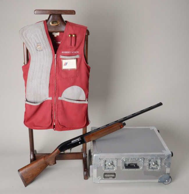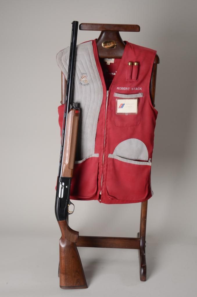 Ensemble belonging to famous motion picture and television actor, Robert Stack, who was a lifetime shooter and National Champion, who served as an advisor to the 1984 Olympic Shooting Team and was a key player in shotgun shooting for a period of over 60 years. This group consists of a Beretta Model A-303, 12 gauge semi-automatic shotgun, showing 28" barrel, blued finish, checkered wood stocks, serial #N67761E. The gun shows 1 screw inchoke and is in near fine used condition. There is a sticker on the front of the forend which reads "Stack". Included in the lot is a shooting vest, embroidered with name Robert Stack at left breast, showing QuailUnlimited logo on right side, with I.D. badge showing Robert Stack when on U. S. Shooting Team. The reverse of the vest is embroidered "Dub Taylor -Dan Reeves, 1989, Celebrity Invitational Sporting Classic"; with wood and brass valet stand showing engraved brass plaque "RSL" (Mr. Stack's initials). This group was sold as individual lots when we auctioned Robert Stack's gun collection approximately 6 years ago, and now